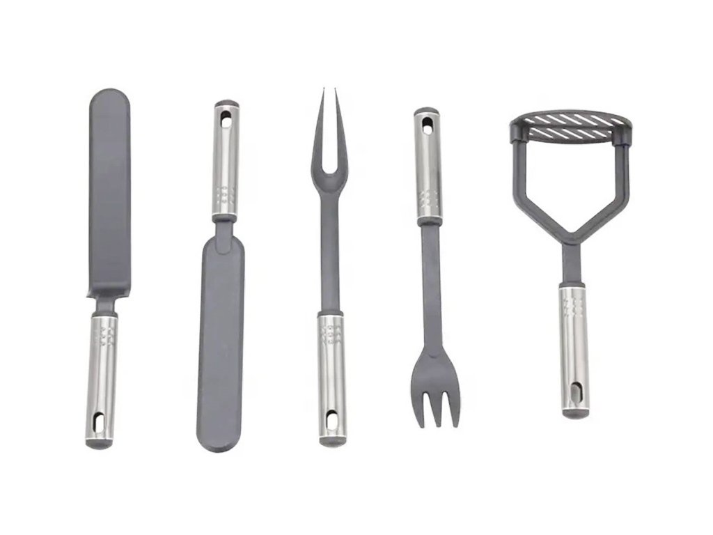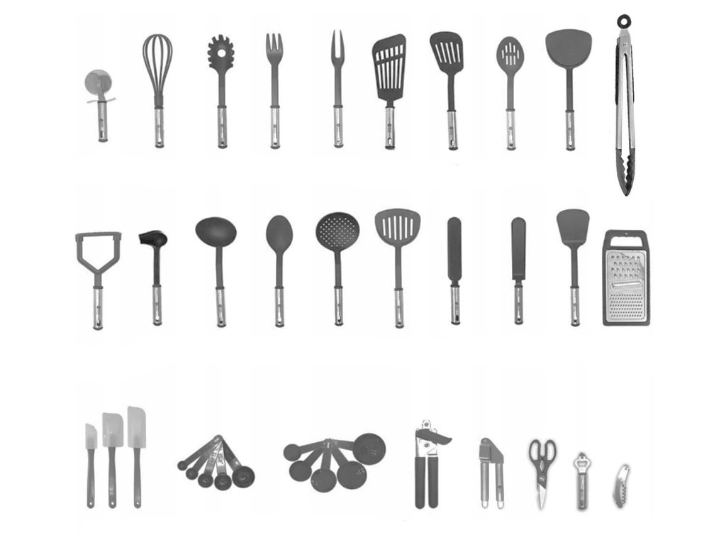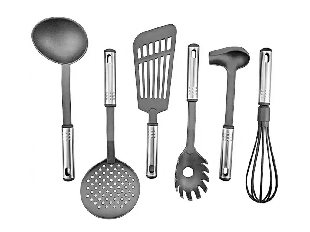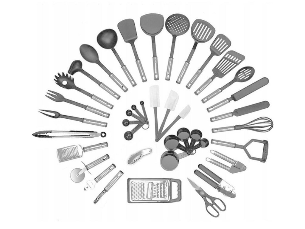Multifunkční a kompletní sada kuchyňských doplňků. Sada obsahuje až 40 nástrojů, které jsou nenahraditelné v každé kuchyni. Vyrobeno z lehkého a odolného materiálu, který nepoškrábe povrch nádobí (nylonové hroty). Odolný vůči vysokým teplotám a bezpečný při kontaktu s potravinami.