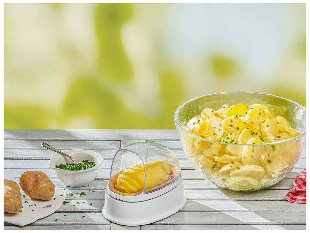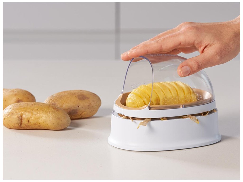 Perfektní vychytávka do kuchyně, díky které jednoduchým a rychlým způsobem oloupete a nakrájíte uvařené brambory na stejné plátky.