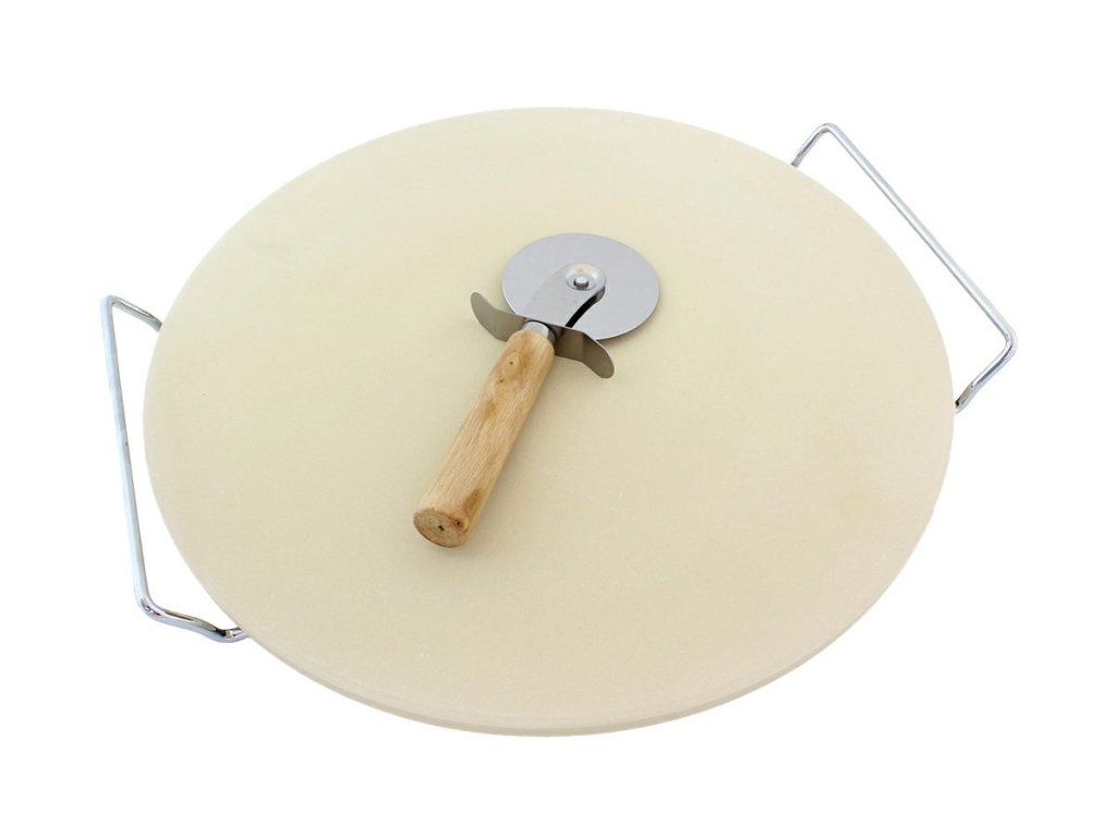 Masivní kámen na pizzu o průměru 33 cm. Rozhodně vám usnadní pečení domácí pizzy, ale také chleba a jiného pečiva. Těsto upečené na kameni se krájí rychleji a spodní část pizzy se na něm nelepí. Sada je vybavena samostatným stojanem z ocelového kamene (slouží také jako rukojeti) a velkým nožem na pizzu s pohodlnou rukojetí.