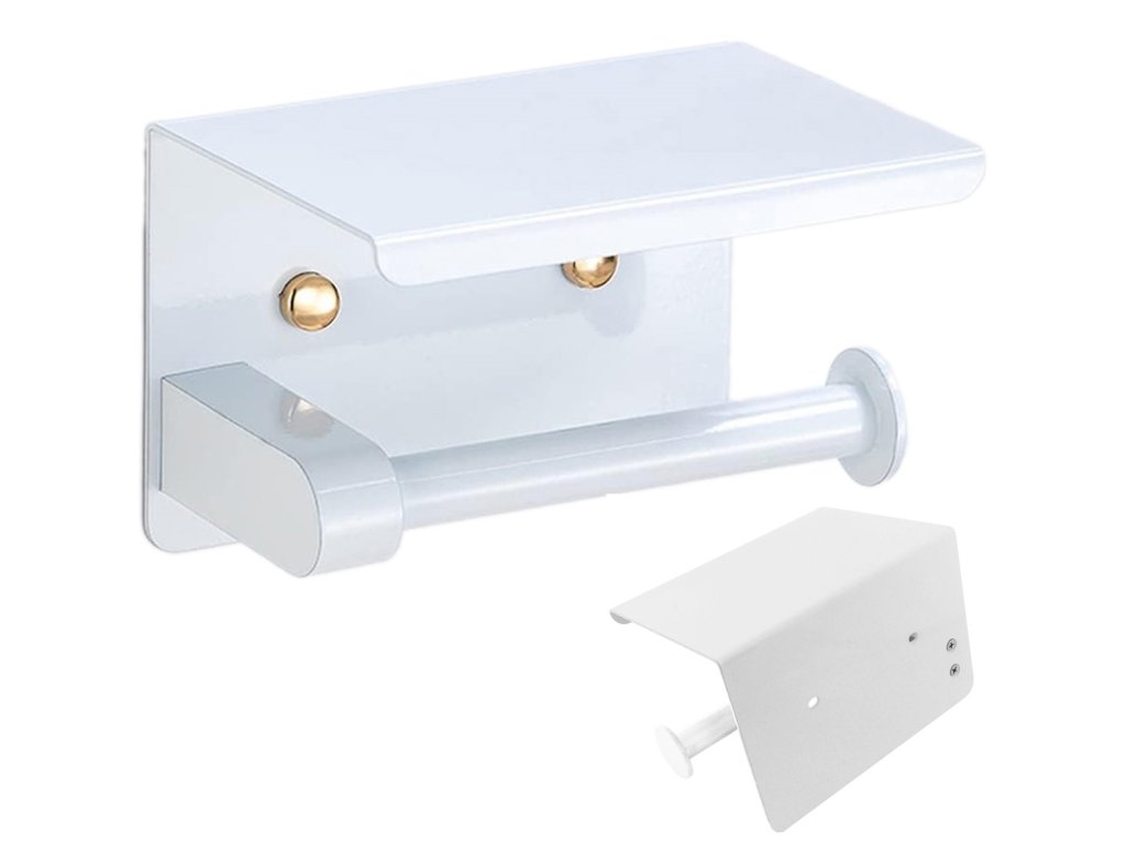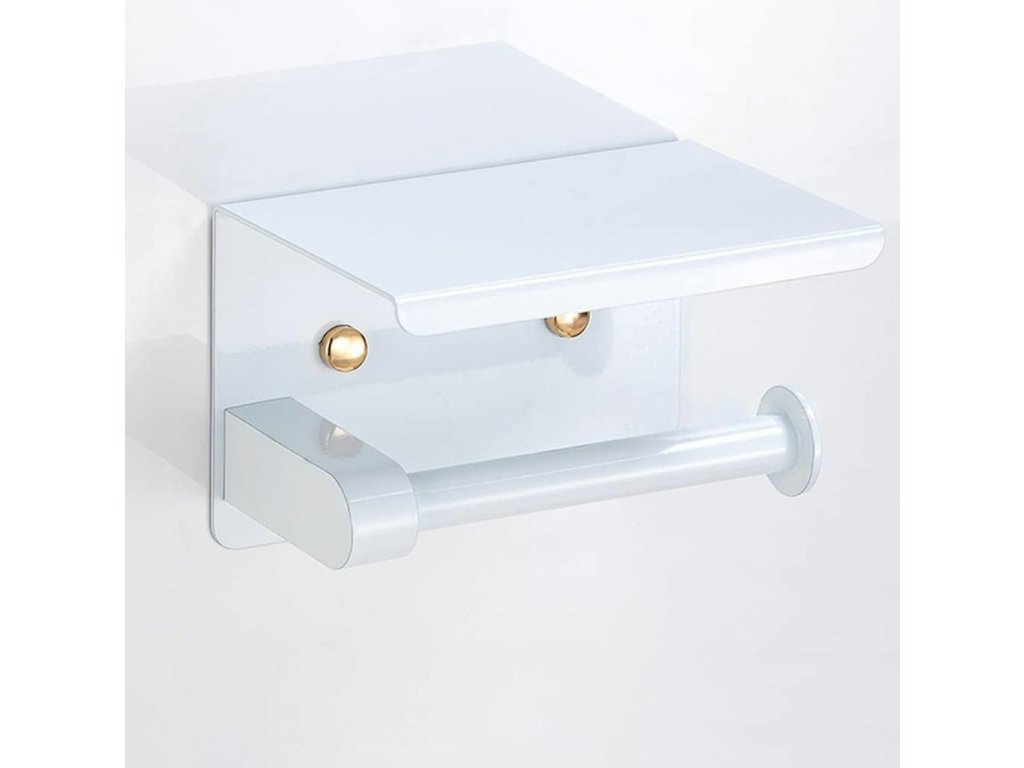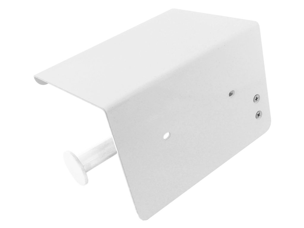 Bílý ocelový držák na toaletní papír v loftovém stylu. Vybaven přídavnou poličkou pro uložení telefonu nebo jiných drobných předmětů. Vyroben z odolné nerezové oceli s práškovým nástřikem (odolná proti korozi). Snadná instalace pomocí přiloženého montážního materiálu (šrouby a podložky).