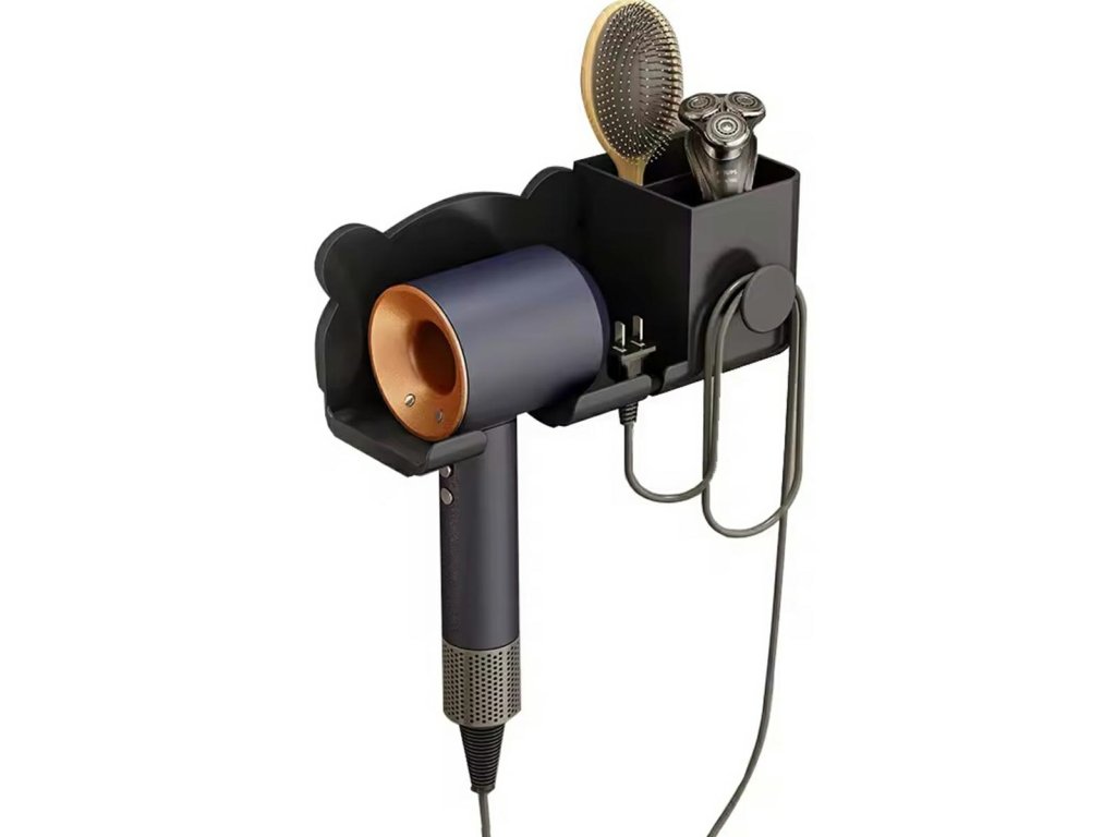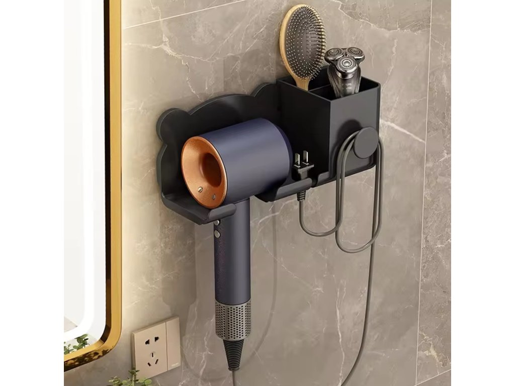 Nástěnný držák na vysoušeč vlasů. Velmi pohodlné řešení a velká úspora místa. Velmi snadná a neinvazivní instalace pomocí oboustranné pásky. Vybaven dvěma přihrádkami na drobnosti a přídavným háčkem na přední straně. Skvěle se bude hodit jako přídavná polička na kosmetiku nebo zubní kartáčky.