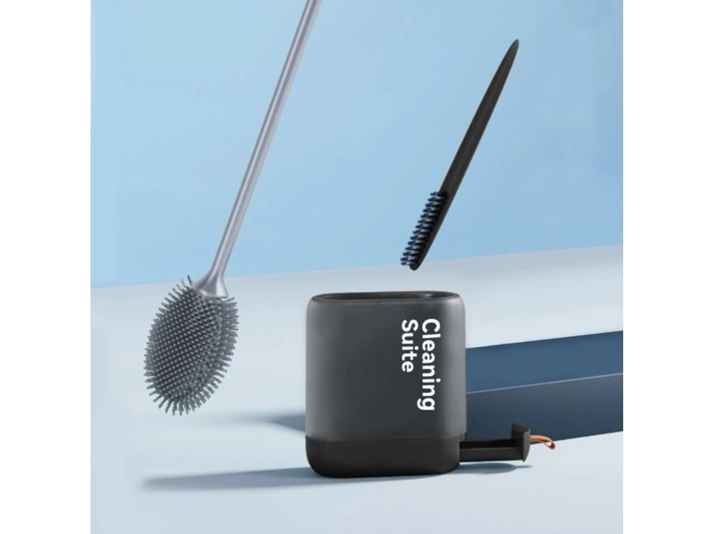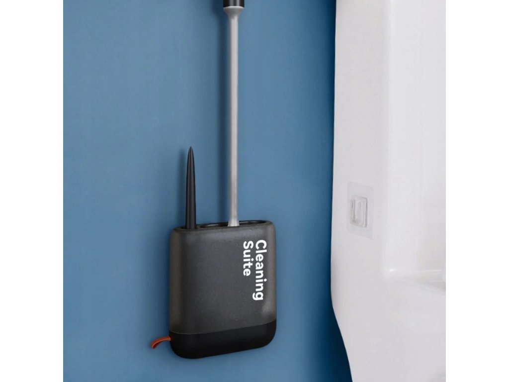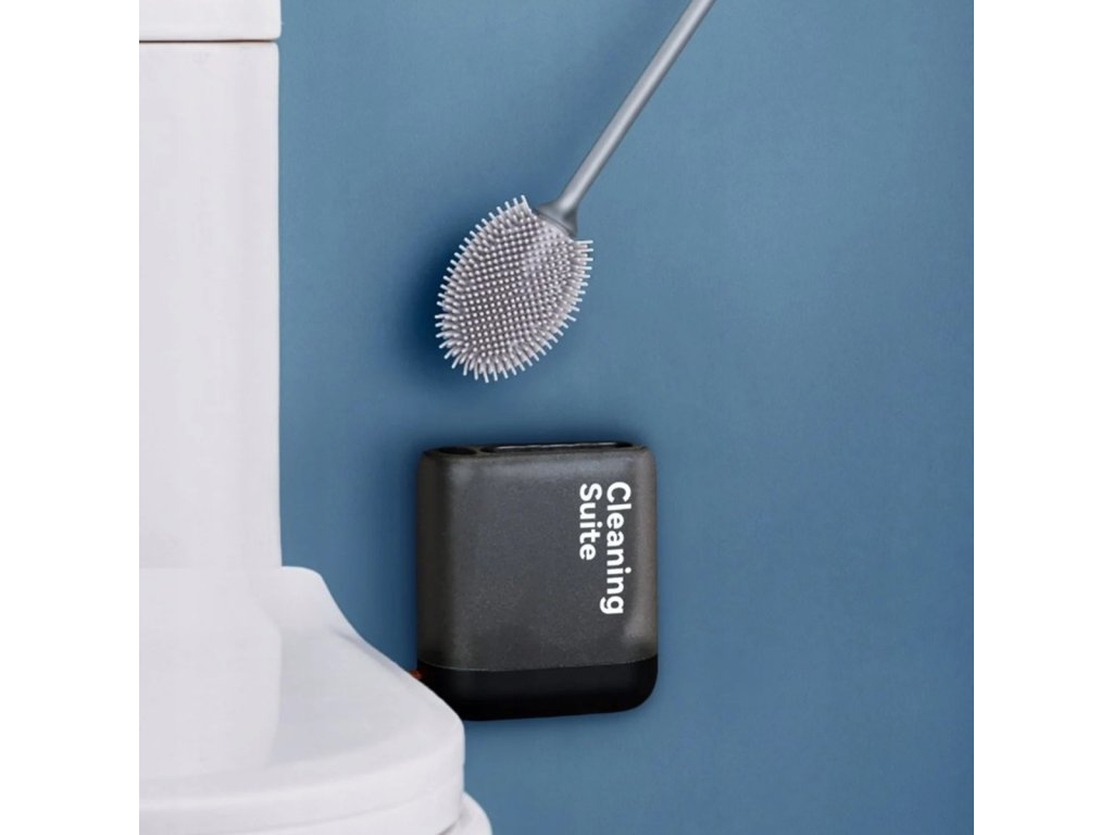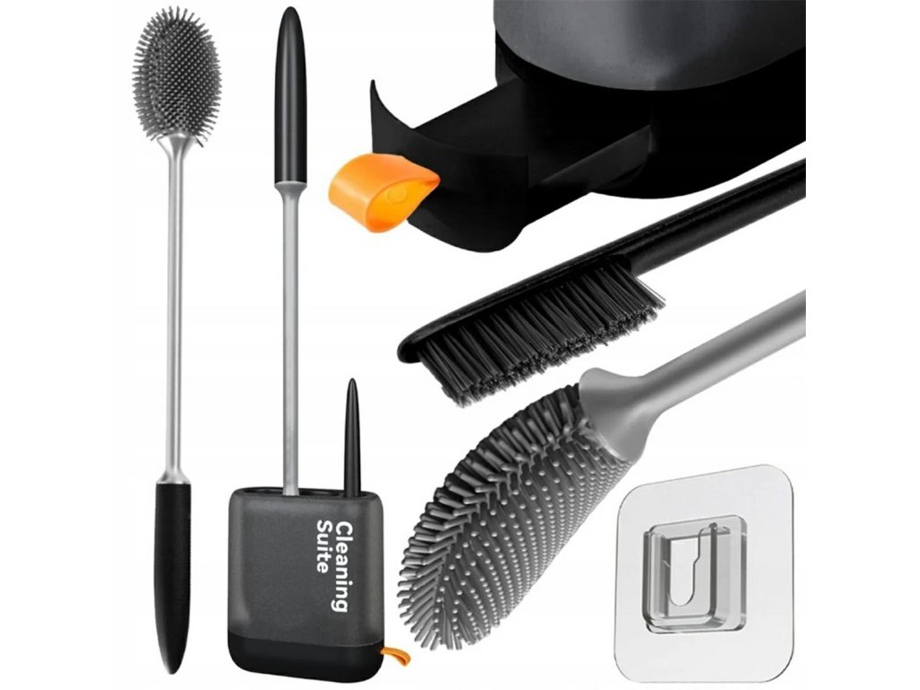 Dvoudílná sada na čištění WC - velký a malý kartáč. Praktická a odolná toaletní štětka vyrobená ze silikonu. Flexibilní štětiny účinně čistí záchodovou mísu. Přídavná rukojeť umožňuje zavěsit kartáče na zeď, což šetří místo. Základna je vybavena těsným dnem s odnímatelným odkapávačem, který zabraňuje odkapávání vody na podlahu.