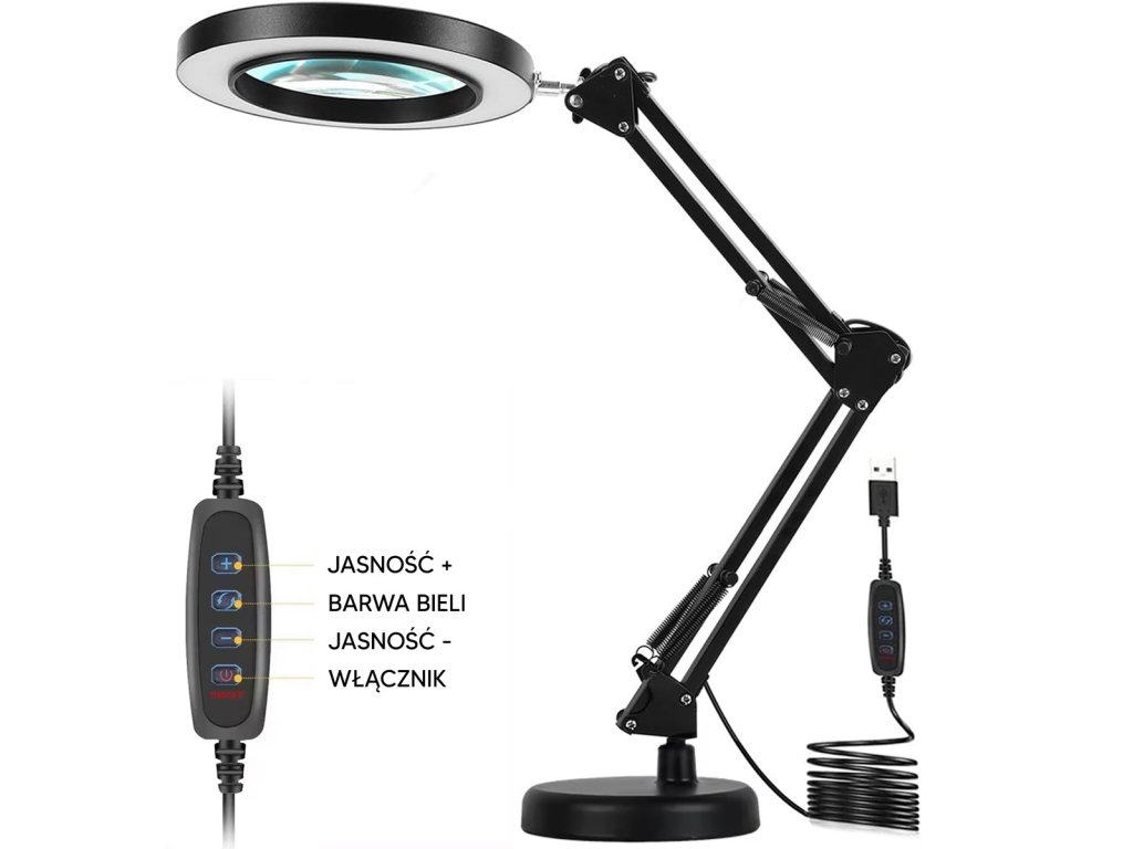 Robustní LED stolní lampa s lupou. Vybavena flexibilním, nastavitelným ramenem, lze ji umístit do libovolného úhlu. Robustní a těžká základna zajišťuje bezpečné umístění na pracovní desce. Velká (3x) lupa je ideální pro kosmetické aplikace. Kruhový LED panel poskytuje silný a dobře rozptýlený paprsek světla, který vám umožňuje soustředit se na práci. Lampa má nastavitelnou bílou barvu (teplá, neutrální a studená). Další výhodou je možnost nastavení úrovně jasu v 10 úrovních. Na napájecím kabelu se nachází praktické dálkové ovládání.