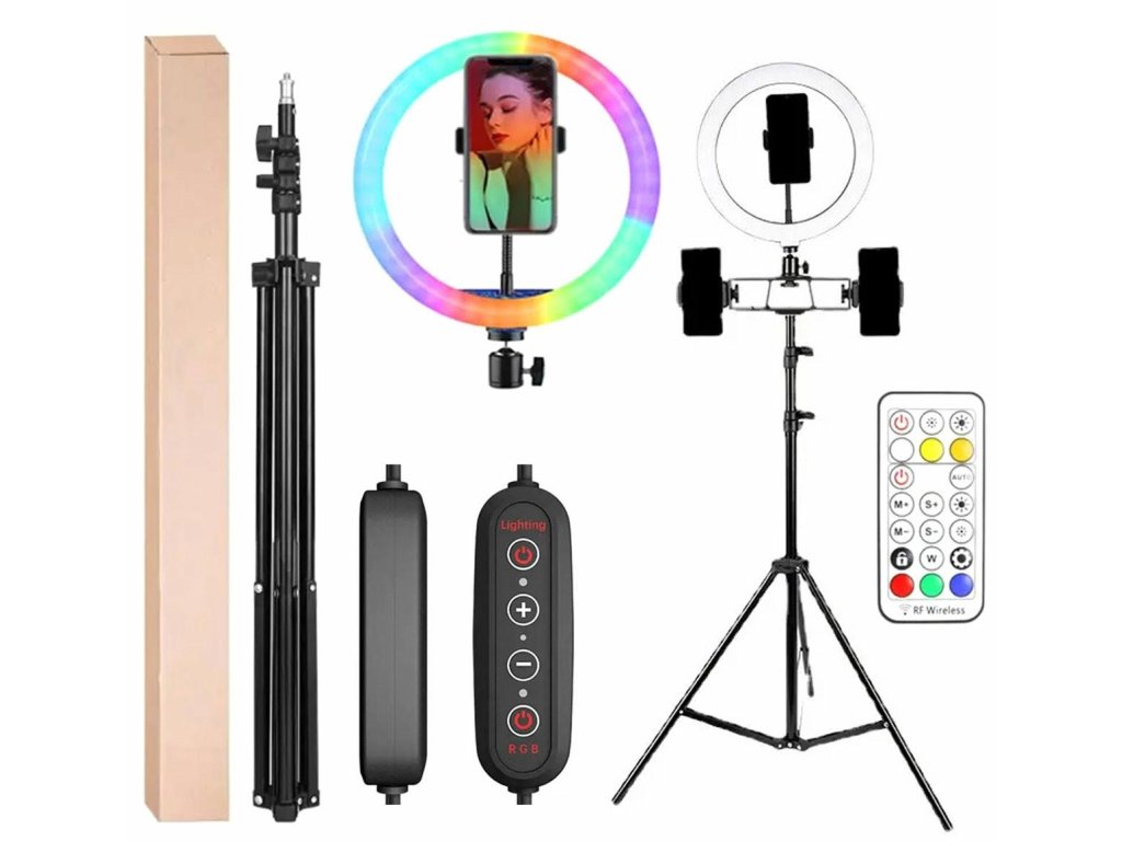 Perfektní sada osvětlení pro každého milovníka selfie! RGB LED kruhová lampa s možností změny barvy osvětlení. Dodává se s třínohým stojanem (stativem), který lze vysunout do výšky až 210 cm. Tohle je rozhodně fotografická nutnost! Nezbytné vybavení pro každé domácí fotoateliér. Zajistí správné světelné podmínky pro každou fotografii a záběr. Lampa má mnoho režimů svícení (včetně změny barevné palety RGB v několika režimech). Prstencová struktura lampy umožňuje vynikající a rovnoměrné osvětlení pracovního prostoru a fotografovaných osob nebo objektů. Skvělé řešení, které bude fungovat za všech podmínek a v každém fotoateliéru. Díky své lehkosti a mobilitě ve složeném stavu jej lze s úspěchem používat i venku. Použití energeticky úsporných LED diod nevyžaduje napájení ze sítě, postačí standardní USB port nebo powerbanka.