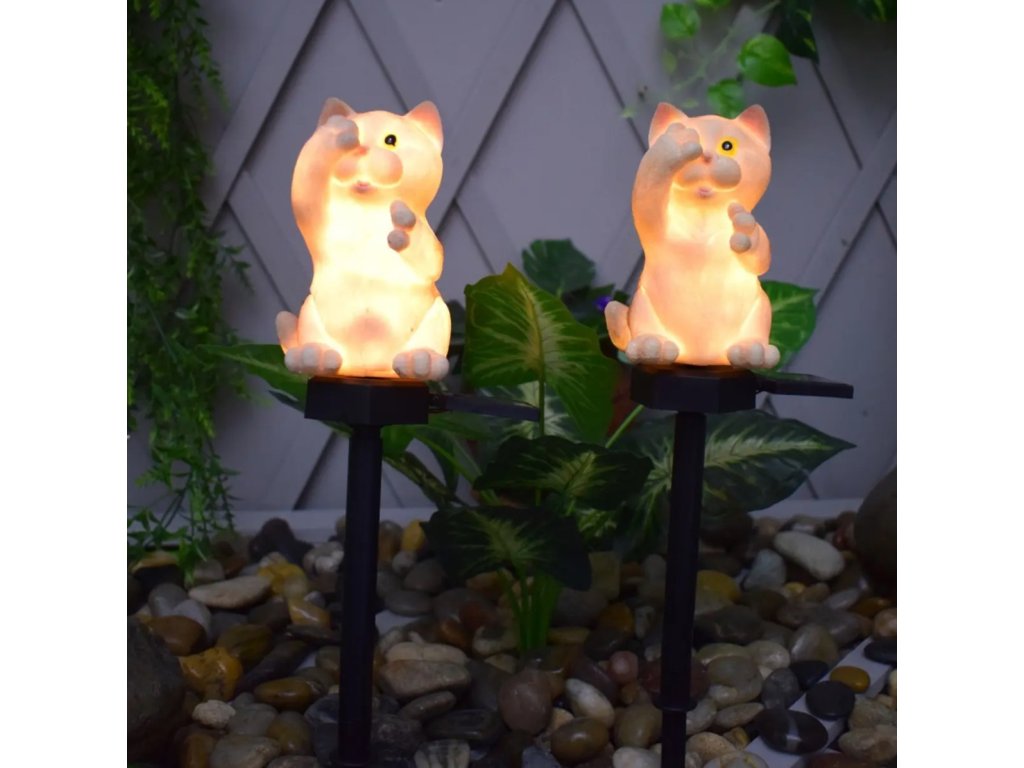 Neobvyklá, solární LED zahradní lampa ve tvaru kočky. Dokonalý dekorativní prvek. Lampa je na solární pohon, který využívá solární panel k nabíjení vestavěné baterie. Zařízení se automaticky zapne při setmění (je vybaveno soumrakovým senzorem) a plně nabitá baterie vystačí až na 8 hodin nepřetržitého provozu. Lampa má LED diodu vyzařující teplé bílé světlo. Silný hrot umožňuje rychlou a bezpečnou instalaci lampy do země, zatímco vodotěsné pouzdro zaručuje bezproblémové použití bez ohledu na povětrnostní podmínky.