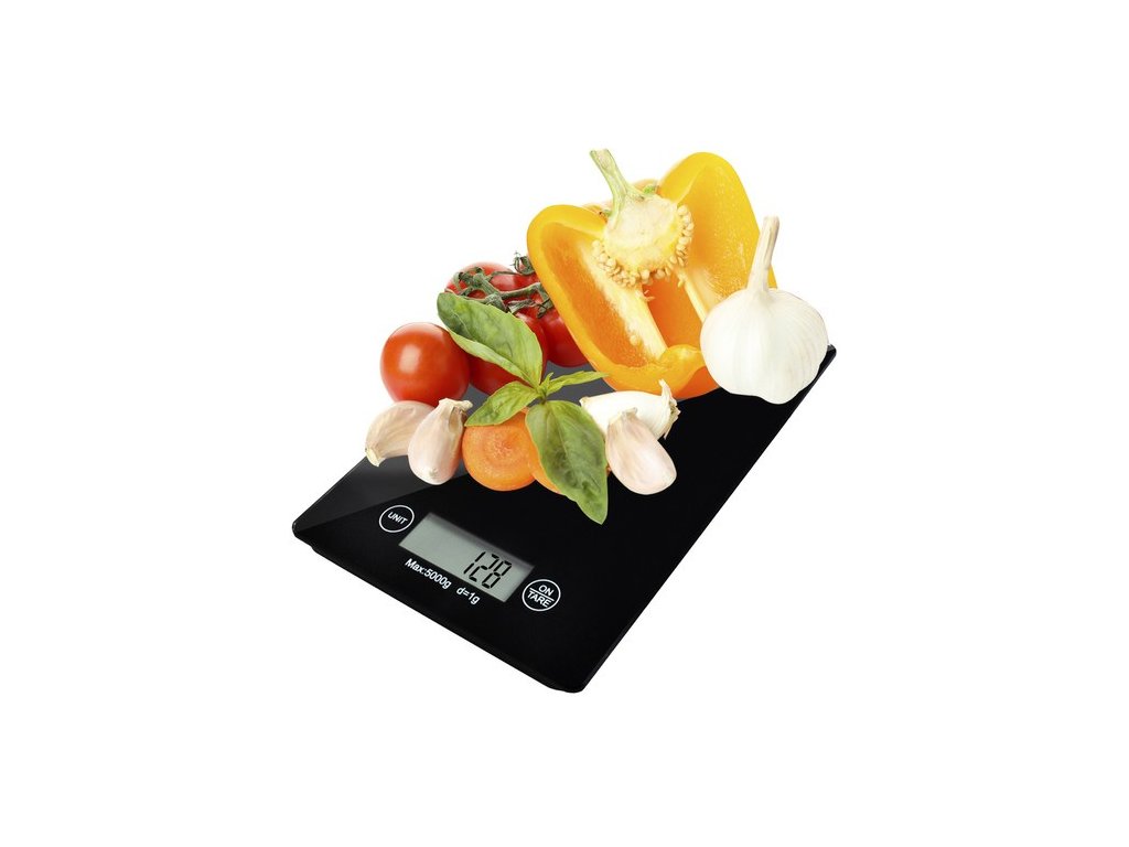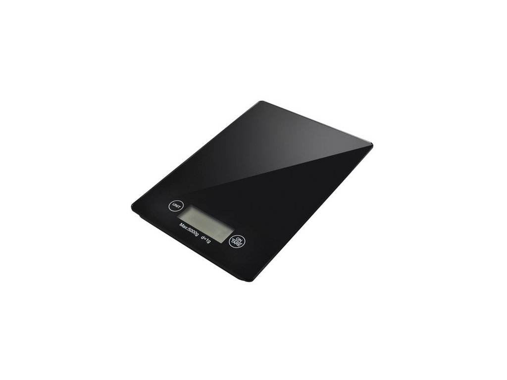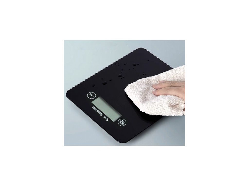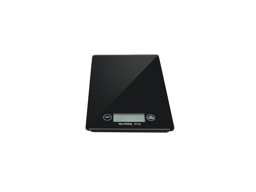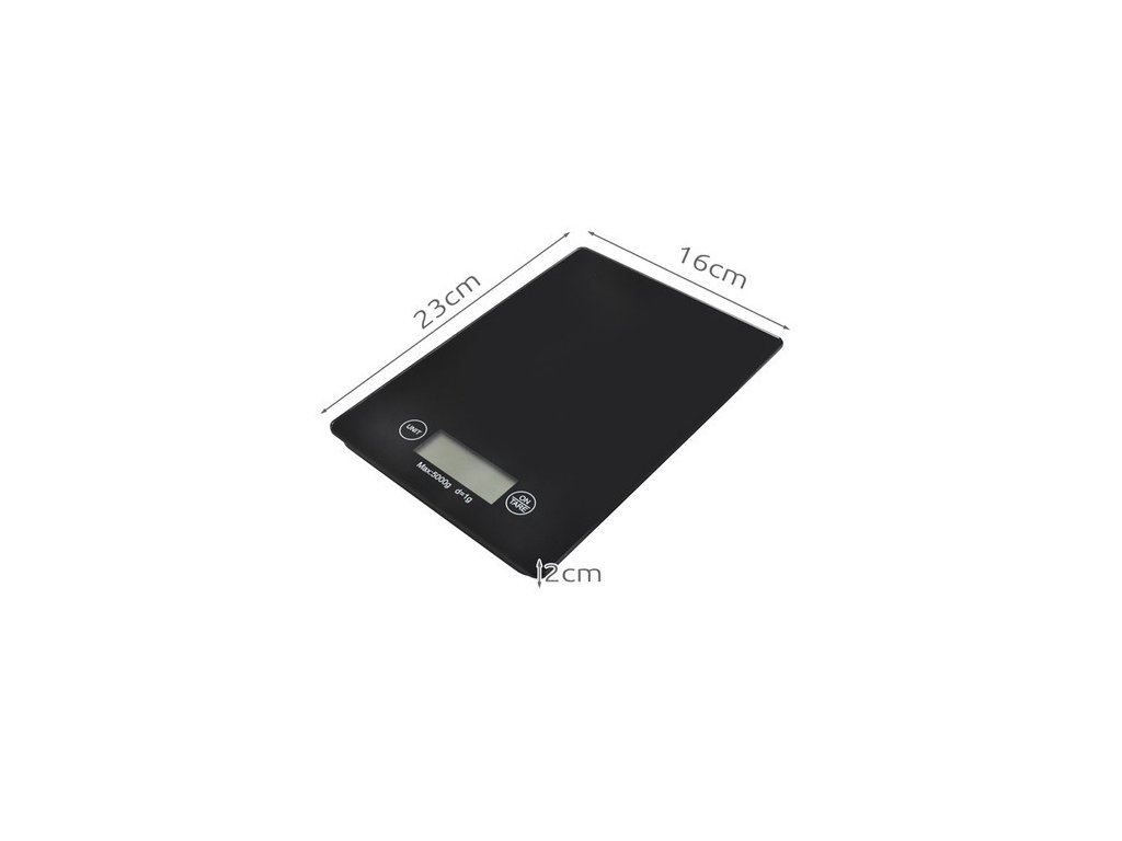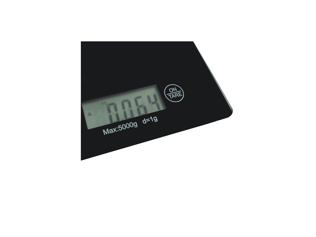 - SPECIFIKACE - funkce tárování: ano; barva: černá; materiál: sklo; maximální zatížení: 5 kg; minimální hmotnost: 2 g; přesnost: 1 g; výběr jednotky hmotnosti: kg / OZ / g / lb; napájení: 2 x AAA (součástí balení); rozměry: 23 x 16 x 2 cm; hmotnost: 600 g; hmotnost balení: 610 g.