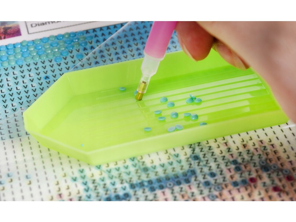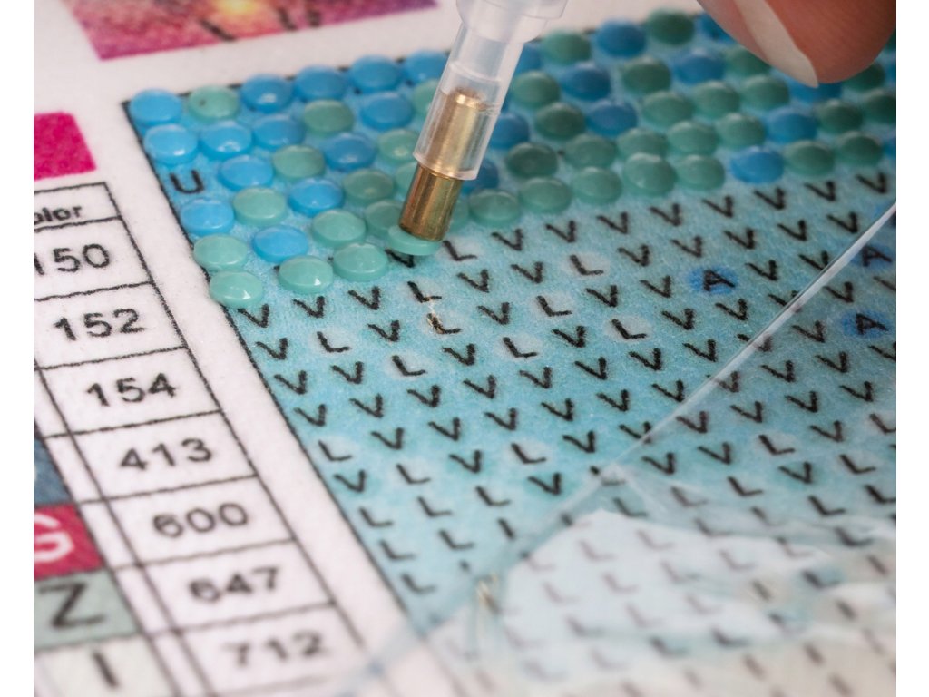 Plátno je zakryto ochrannou fólií, kterou sundávejte vždy postupně tak, jak budete aplikovat kamínky. Při sundání celé fólie najednou hrozí, že se ztratí viskozita lepidla a kamínky nebudou držet. Plátno obsahuje označení, která jsou umístěna i na sáčcích s kamínky. Dle těchto označení víte, kam který kamínek patří. Nejprve si do hrotu tužky naberte vosk, díky kterému se kamínky snadno přichytí na tužku. Pak kamínky tužkou aplikujte na plátno. Jakmile máte hotovo, můžete jej umístit do rámu a vznikne vám tak krásný obraz.