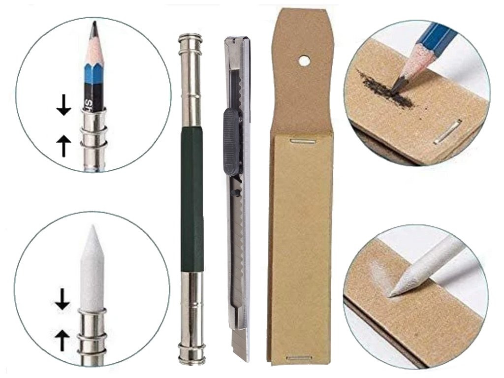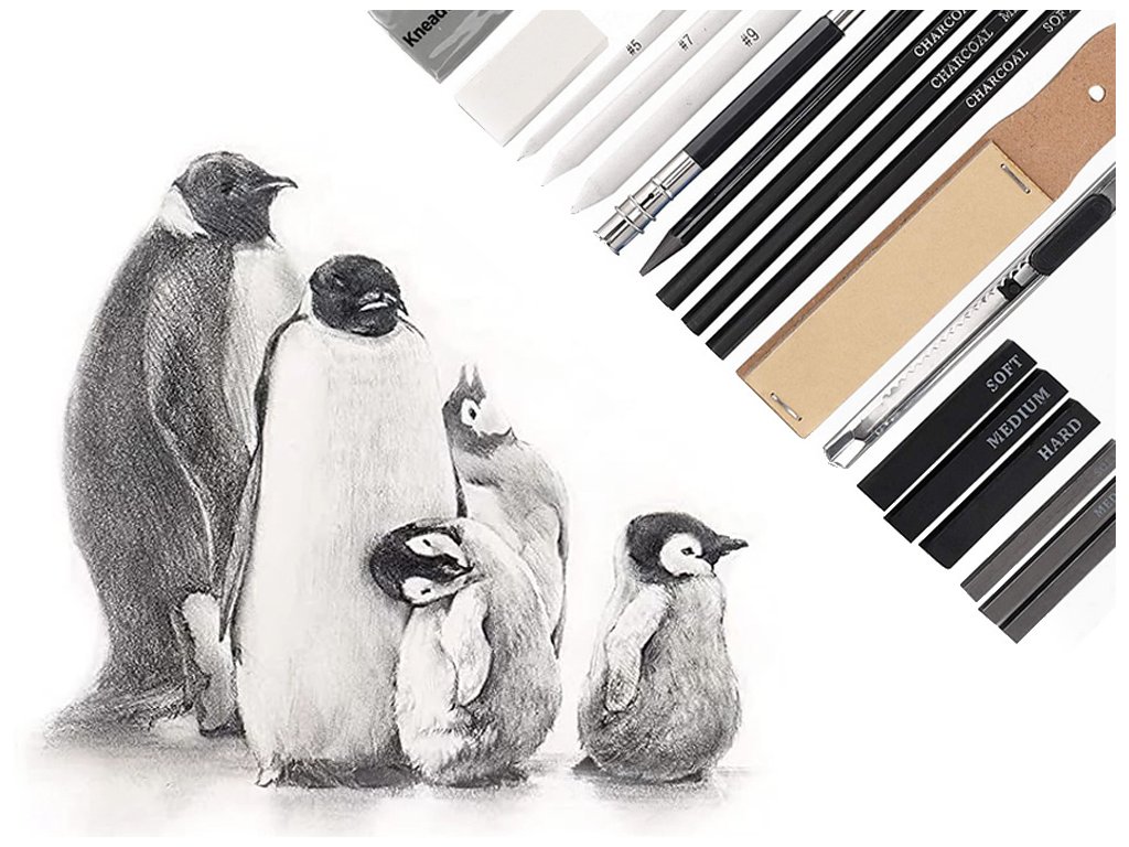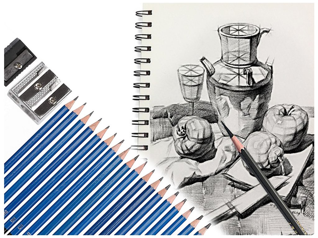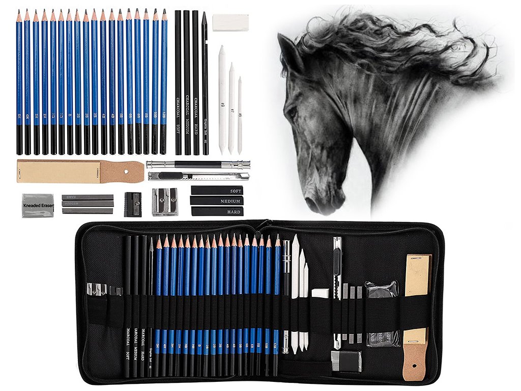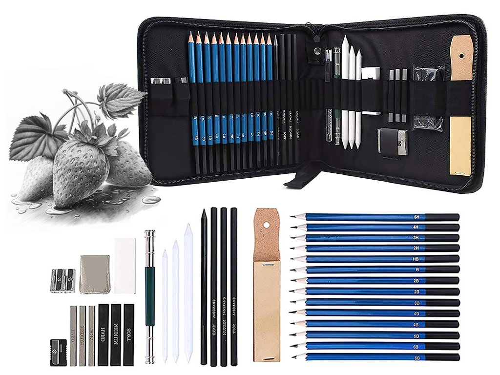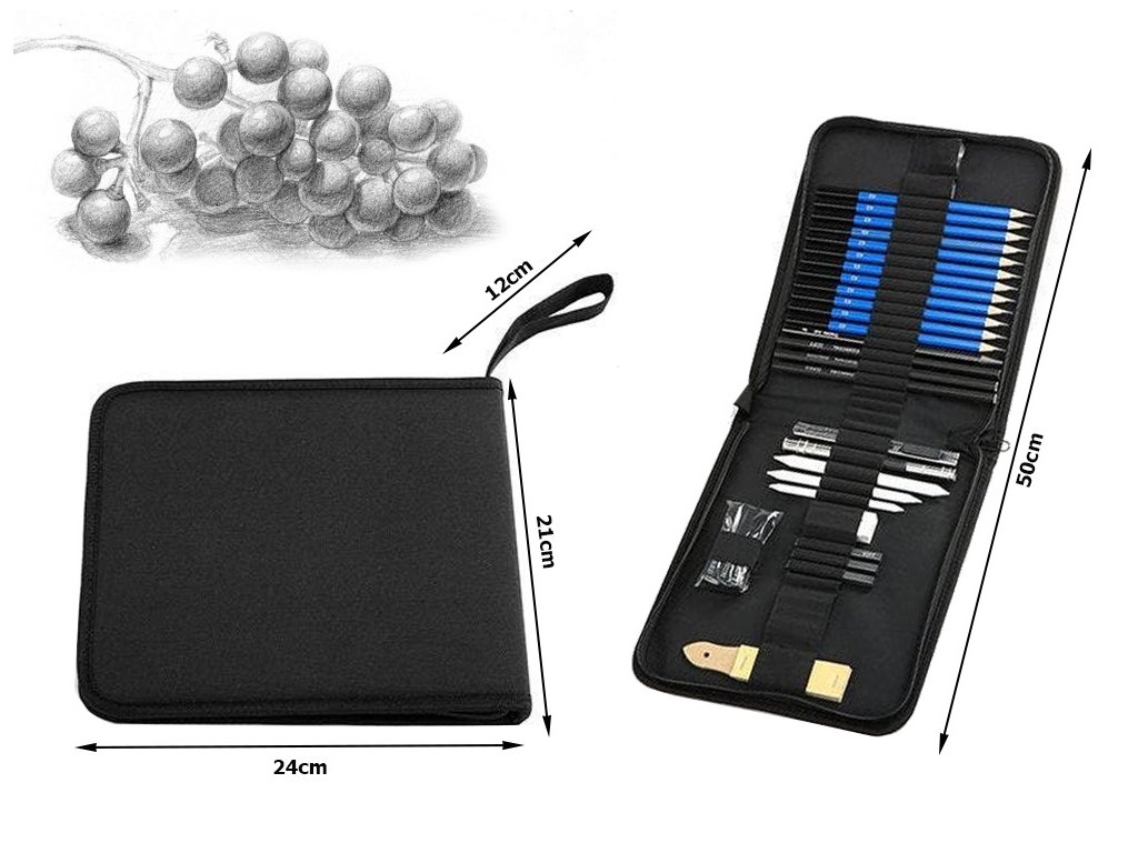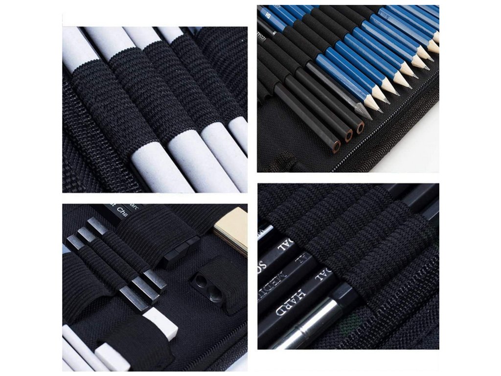 Sada obsahuje tužky různých tvrdostí, uhelné tužky, grafitové tužky, grafitové tyčinky, uhelné tyčinky, blendry, nůž, nástavec, gumu, ořezávátko, blok smirkového papíru.