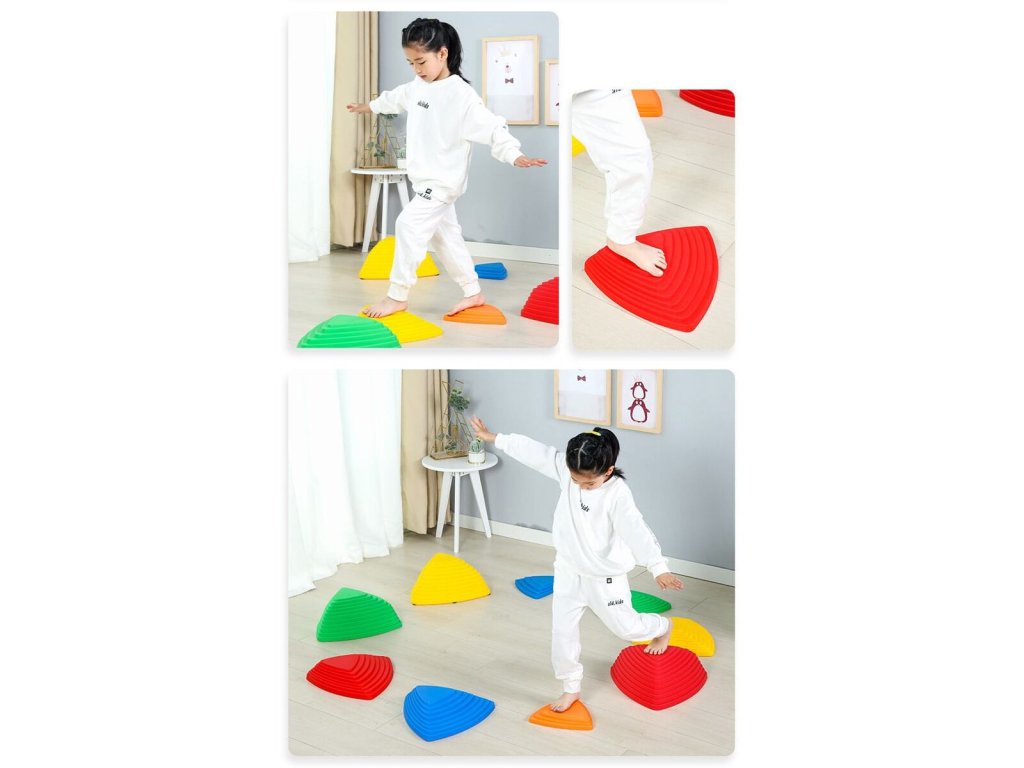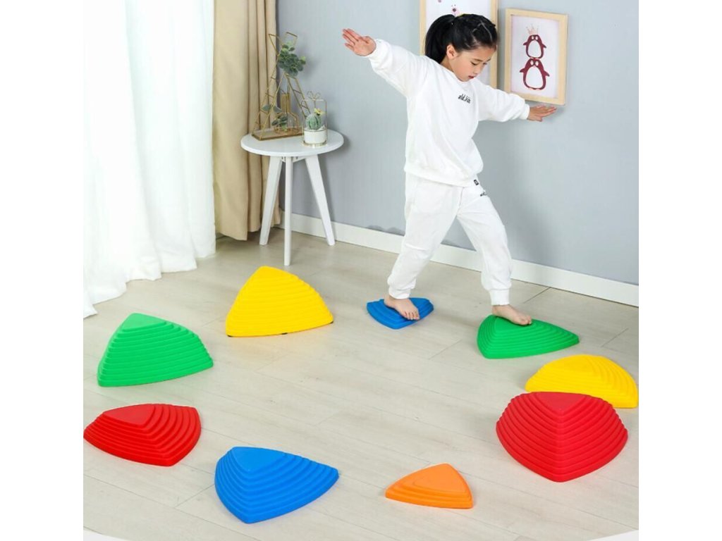 Sada Balance Stepping Stones tvořená 11 plastovými nášlapnými bloky-kameny ve tvaru trojúhelníku umožňuje sestavit zábavnou dráhu pro děti, které si na ní formou hry mohou trénovat své koordinační dovednosti, rovnováhu a prostorovou orientaci. Kameny ve čtyřech velikostech a pěti barvách jsou opatřené protiskluzovými podložkami, které zajišťují jejich stabilitu. Ať si už děti budou hrát na přecházení rozvodněné řeky, překonávání různých překážek, nebo prostě jen tak šlapat z kamene na kámen, užijí si se sadou balančních kamenů Balance Stepping Stones 11 spoustu zábavy. Ideální pomůcka pro školky, školy nebo zájmové kroužky. Kombinovat ji můžete s Balance Bridge 884 motorickou dráhou. - maximální nosnost 1 kamene: 50 kg - materiál: plast PE - nevhodné pro děti do 3 let. Vždy používejte pod dohledem dospělé, zodpovědné osoby! Obsah balení: - 2 extra velké kameny (rozměr 1 kusu: 40x40x40 cm, výška 20 cm, hmotnost 700 g) - 2 velké kameny (rozměr 1 kusu: 38x38x38 cm, výška 16 cm, hmotnost 550 g) - 3 střední kameny (rozměr 1 kusu: 35x35x35 cm, výška 8 cm, hmotnost 400g) - 4 malé kameny (rozměr 1 kusu: 24x24x24 cm, výška 4,5 cm, hmotnost 160 g) - 66 protiskluzových podložek v samostatném baleníDodatočné parametre