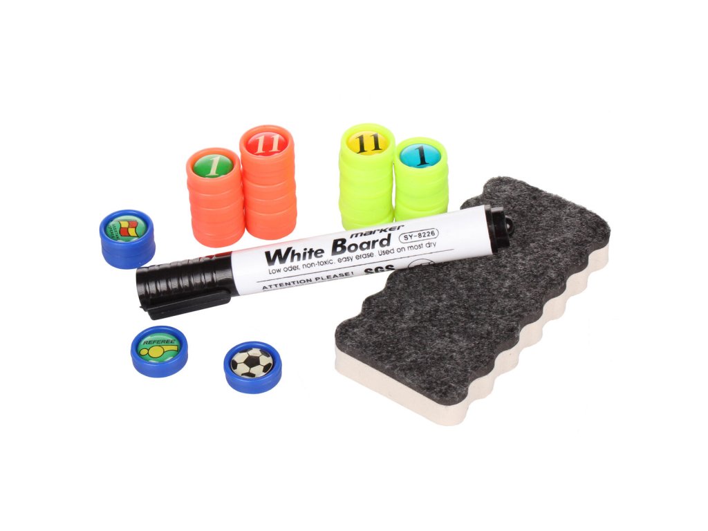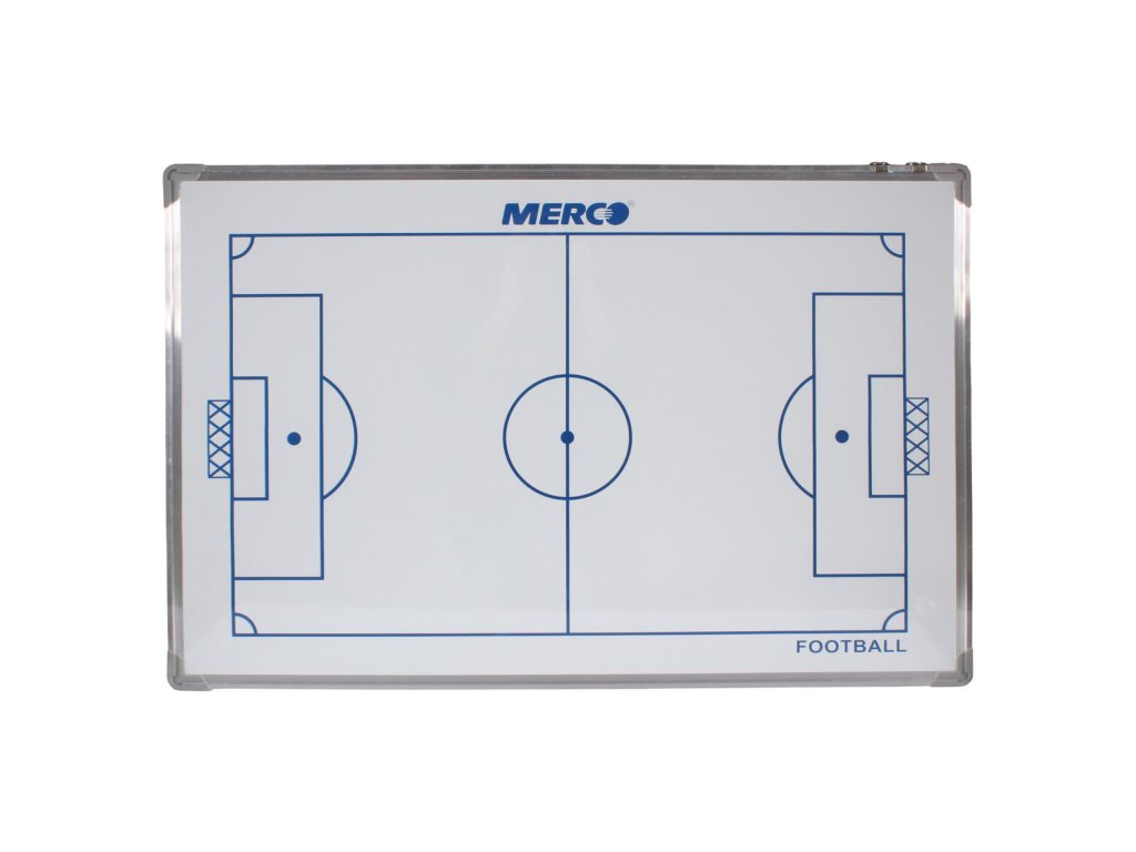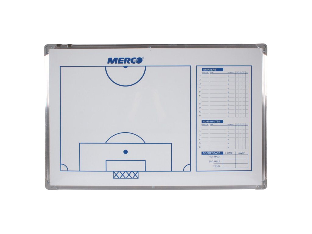 Fotbalová trenérská tabule je užitečným asistentem trenérů napříč všemi soutěžemi. Taktická tabule Merco Football 90 je magnetická deska se dvěma sadami magnetů pro plánování a analýzu výkonů hráčů. Oboustranně magnetická tabule zobrazuje fotbalové hřiště na jedné straně. Na druhé straně je ze dvou třetin znázorněná polovina hřiště a tabulka pro soupisku hráčů. Součástí tabule Football 90 jsou dvě sady číslovaných magnetů 1 – 11 a čtyři další magnety reprezentující rozhodčí a míč, součástí je také černý popisovač a houbička pro detailnější popis herní strategie. Tabule je usazená v aluminiovém rámu s rozměry 90 x 60 x 2 cm a má hmotnost přibližně 2 kg. Na horním okraji tabule jsou dva háčky pro případné zavěšení na zeď. Předejte potřebné instrukce vašim hráčům pomocí trenérské tabule srozumitelným a jasným způsobem díky taktické tabuli Football 90.Dodatočné parametre