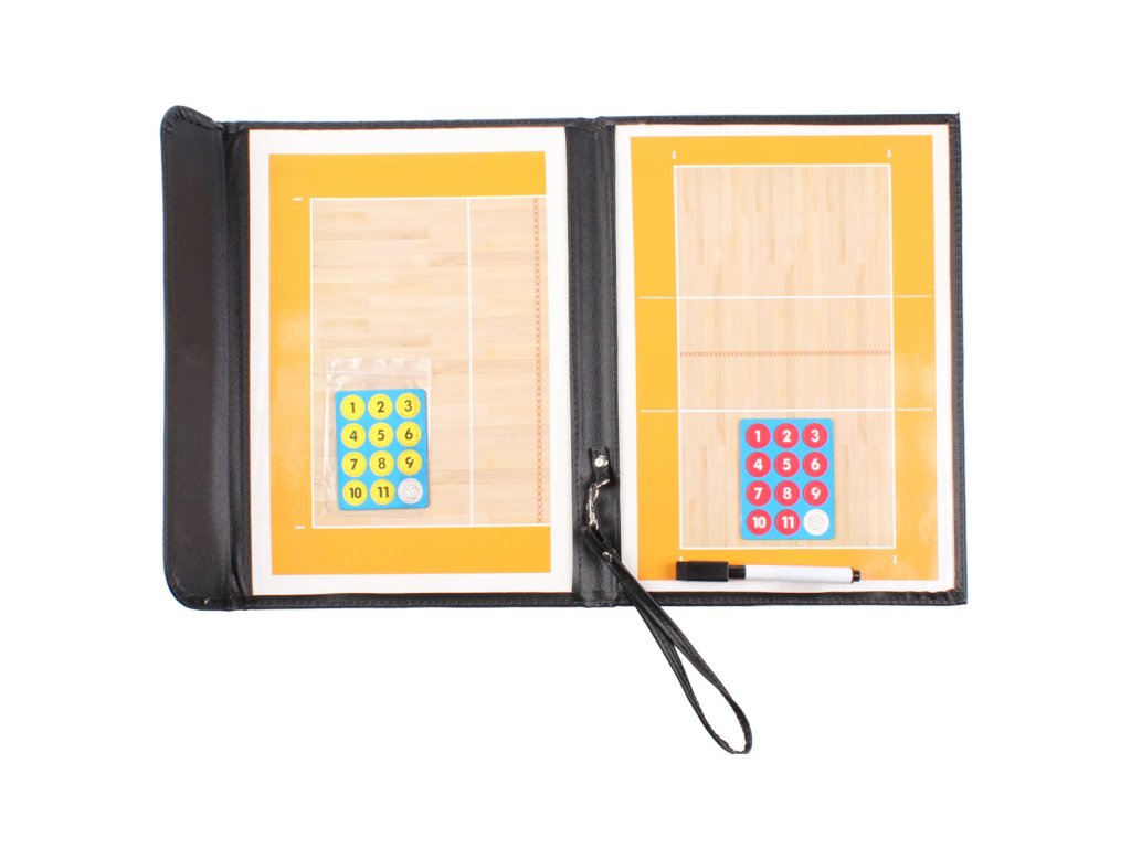Trenérská tabule Volleyball RX91 patří mezi základní vybavení trenéra soutěžního volejbalového klubu pro demonstrování a plánování nejrůznějších herních strategií. Pro rozmístění hráčů v poli využijete dvě sady odlišně barevných magnetů s čísly a pro další tahy a pohyby hráčů černý popisovač. Magnetická trenérská tabule znázorňuje celé hřiště na jedné straně a polovinou hřiště na straně druhé, má po rozložení rozměry 47 x 31,5 cm a hmotnost přibližně 500 gramů. Tvrdé desky tabule s magnetickým flapem mají rozměry 31,5 x 24 cm jejich povrch je zhotovený ze syntetické PU kůže s oděruvzdornými vlastnostmi. S trenérskou tabulí Volleyball RX91 potřebujete pro svůj tým už jen geniální taktický plán!Dodatočné parametre