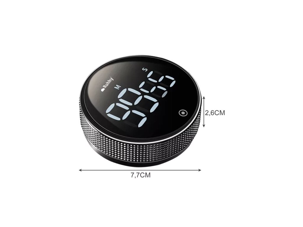 - SPECIFIKACE - barva: černá; napájení: 4,5V; napájení: 3xAAA (není součástí balení); provozní rozsah: 0-99 min 55 sec.; ovládání hlasitosti: ano; rozměry: 7,7/7,7/2,6cm; hmotnost: 0,07 kg; hmotnost v balení: 0,089 kg;