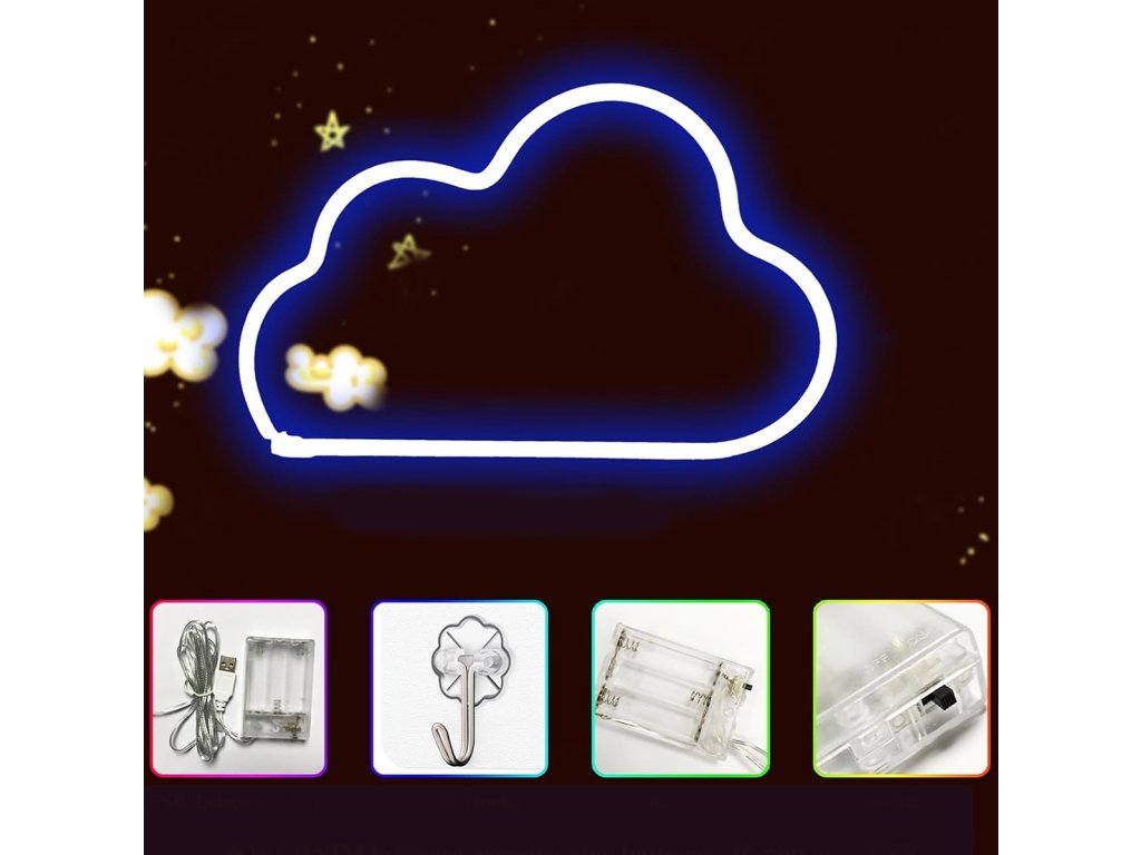 Dekorativní LED lampa ve tvaru mraku. Zařízení dokonale napodobuje vzhled neonové trubice. Určeno k zavěšení na zeď (speciální háček v horní části lampy). Lampa využívá jasné LED podsvícení s intenzivní modrou barvou. K napájení potřebujete pouze 3 x AA 1,5V baterie nebo USB port (nemusíte jej zapojovat do sítě). Je ideální pro všechny druhy speciálních událostí, svatby nebo jako relaxační osvětlení.