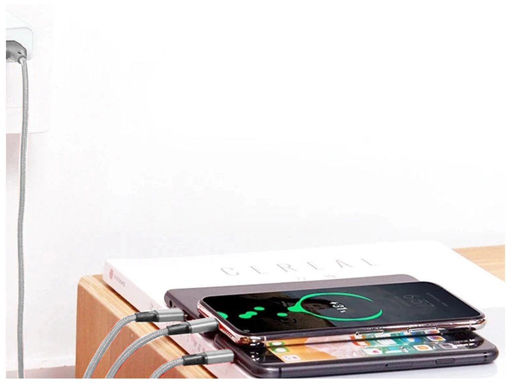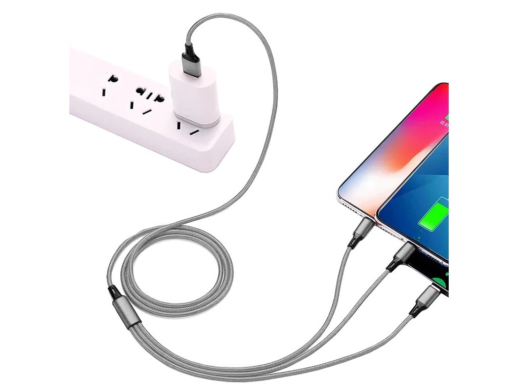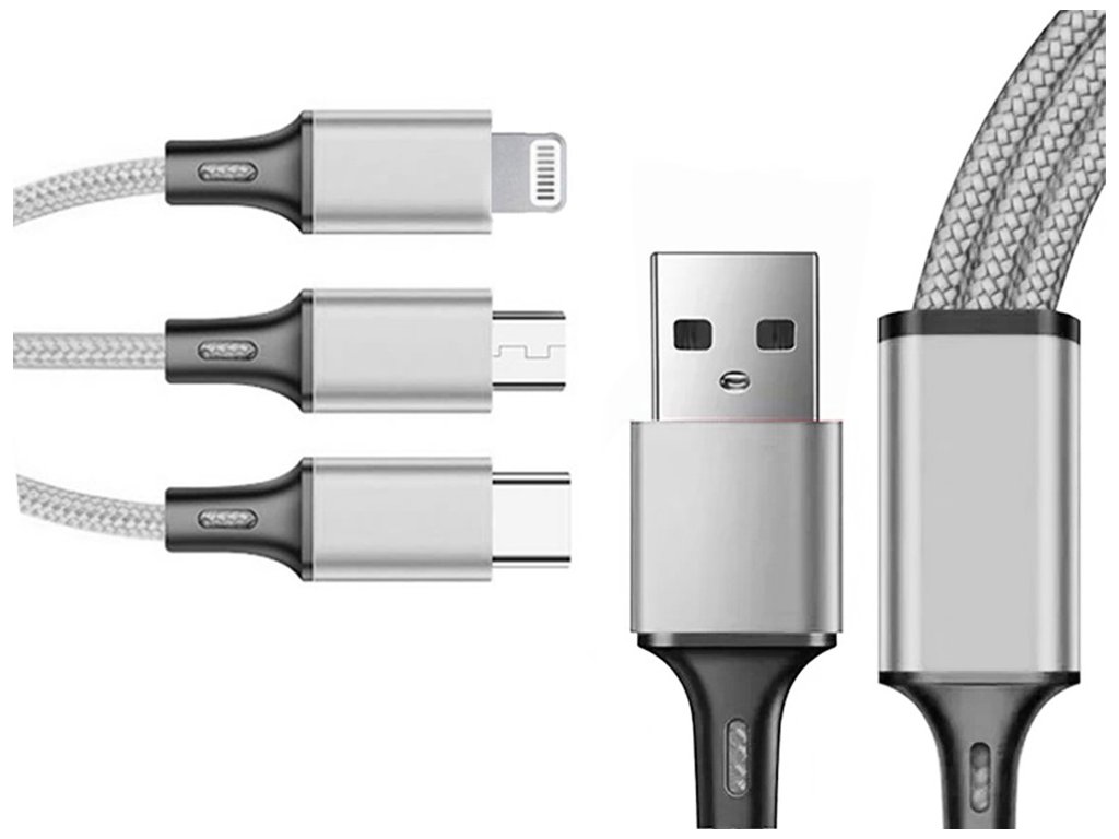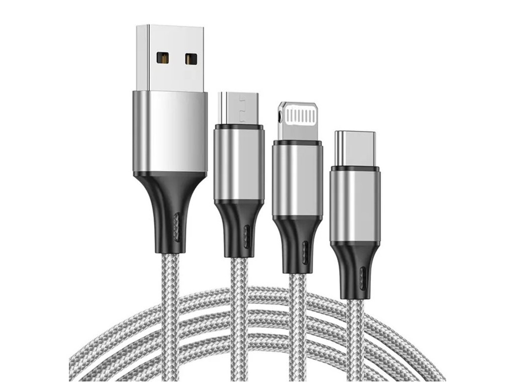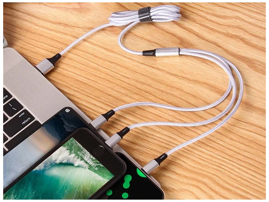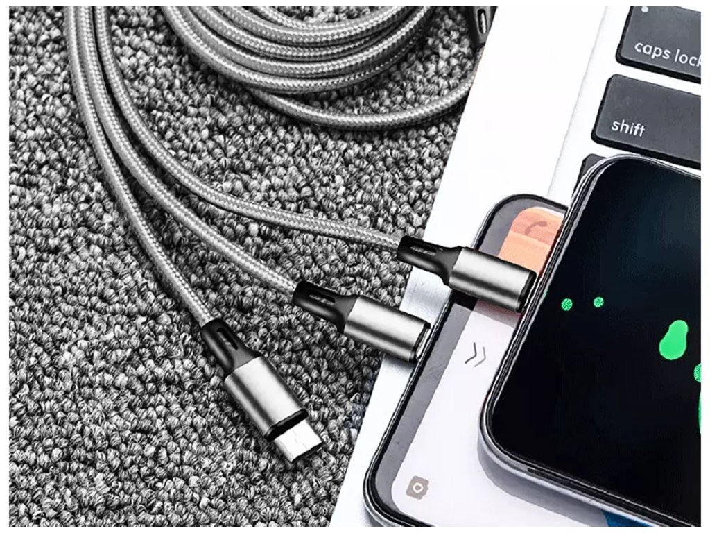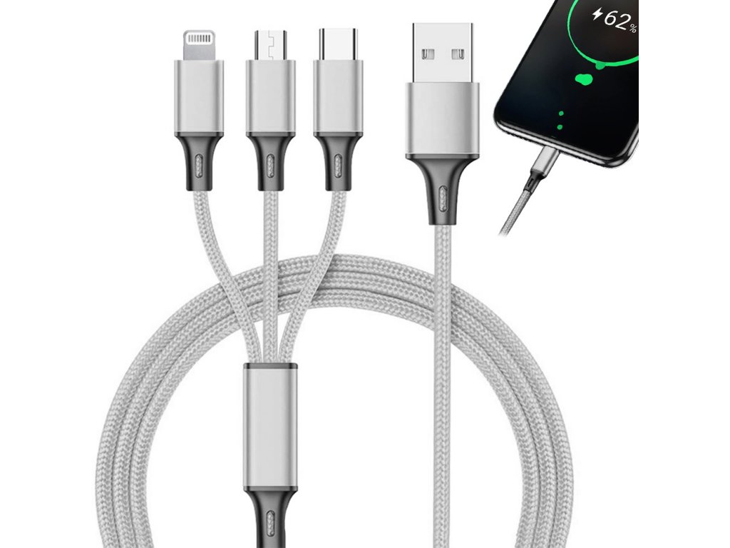 Kabel USB 3 v 1 je dokonalým řešením, které vám pomůže nabíjet telefon a další elektronická zařízení. Byl navržen tak, aby vydržel dlouhé a intenzivní používání. Opletený kabel zabraňuje jeho sekání a lámání.