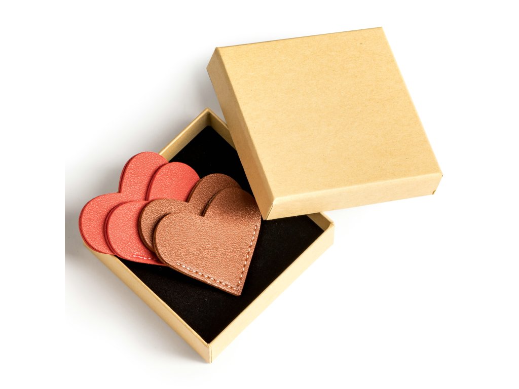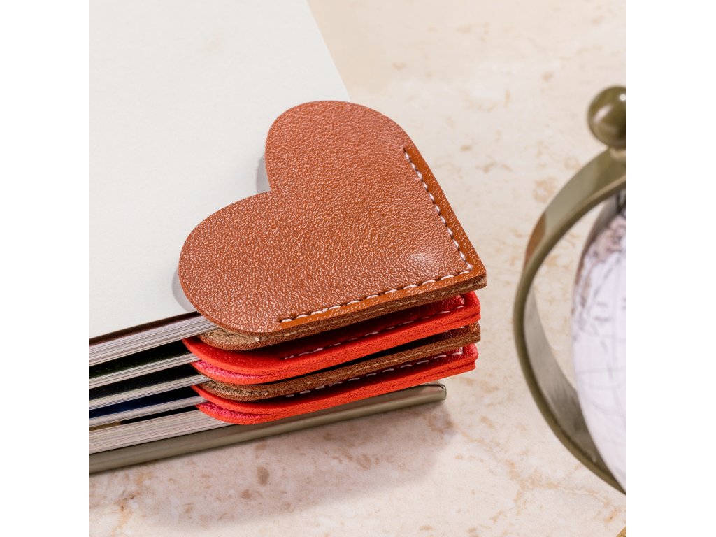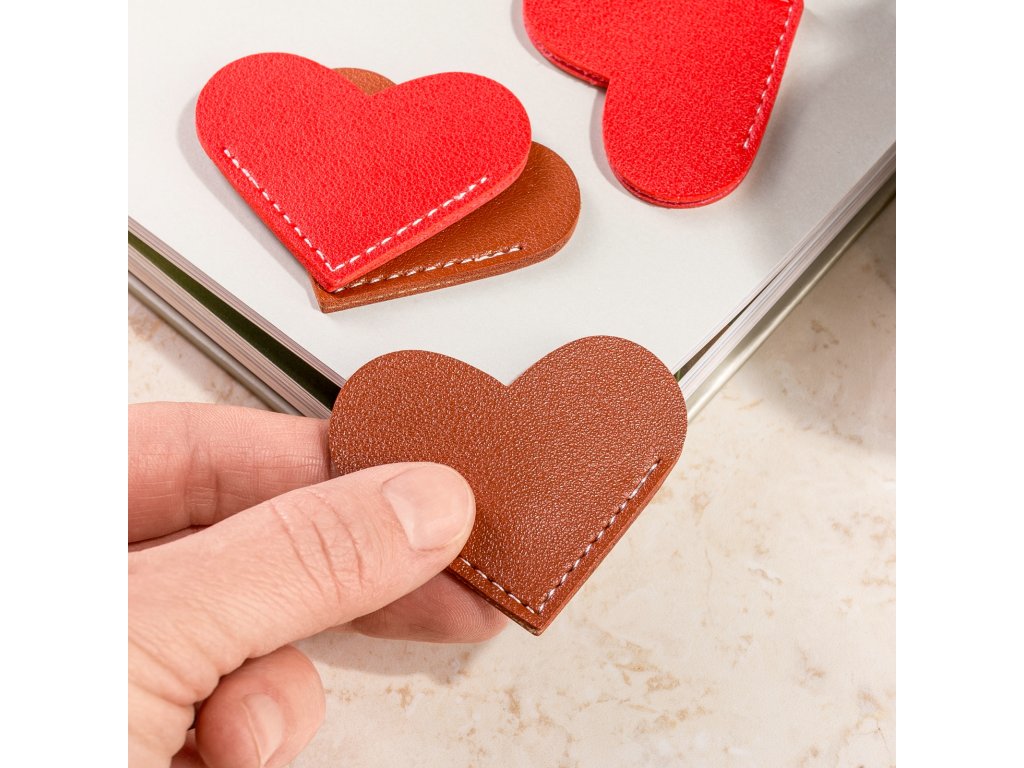 Elegantní záložky ve tvaru srdce vyrobené z kvalitní PU kůže s jemným bílým šitím. Umísťují se na roh stránky a můžete si tak označit, kde přesně jste skončili. Zároveň můžou posloužit jako ochrana rohů knižní vazby před poškozením.