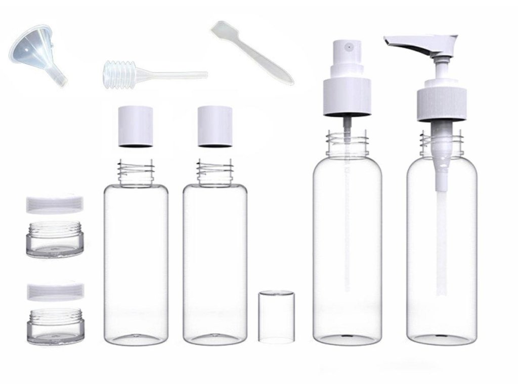 Devítidílná cestovní kosmetická sada, ideální pro plánování vaší cesty letadlem. Nádoby na tekutiny a krémy jsou v rámci povolených kapacitních limitů používaných leteckými společnostmi. Naše sada je také skvělým řešením pro ženy, které si kosmetiku připravují samy doma!