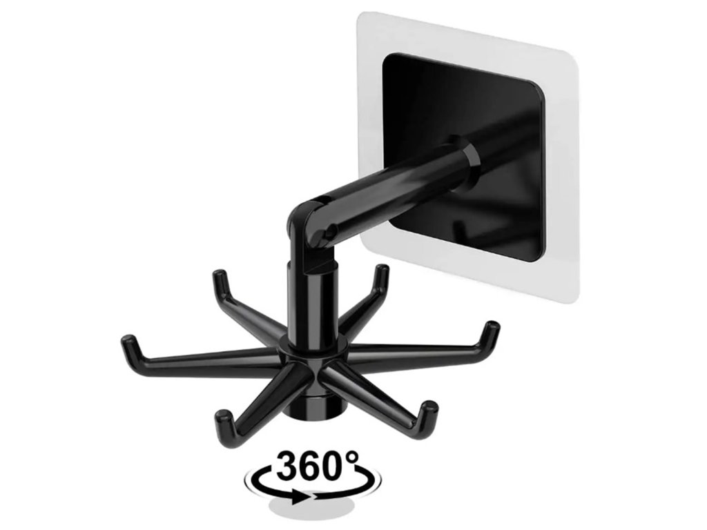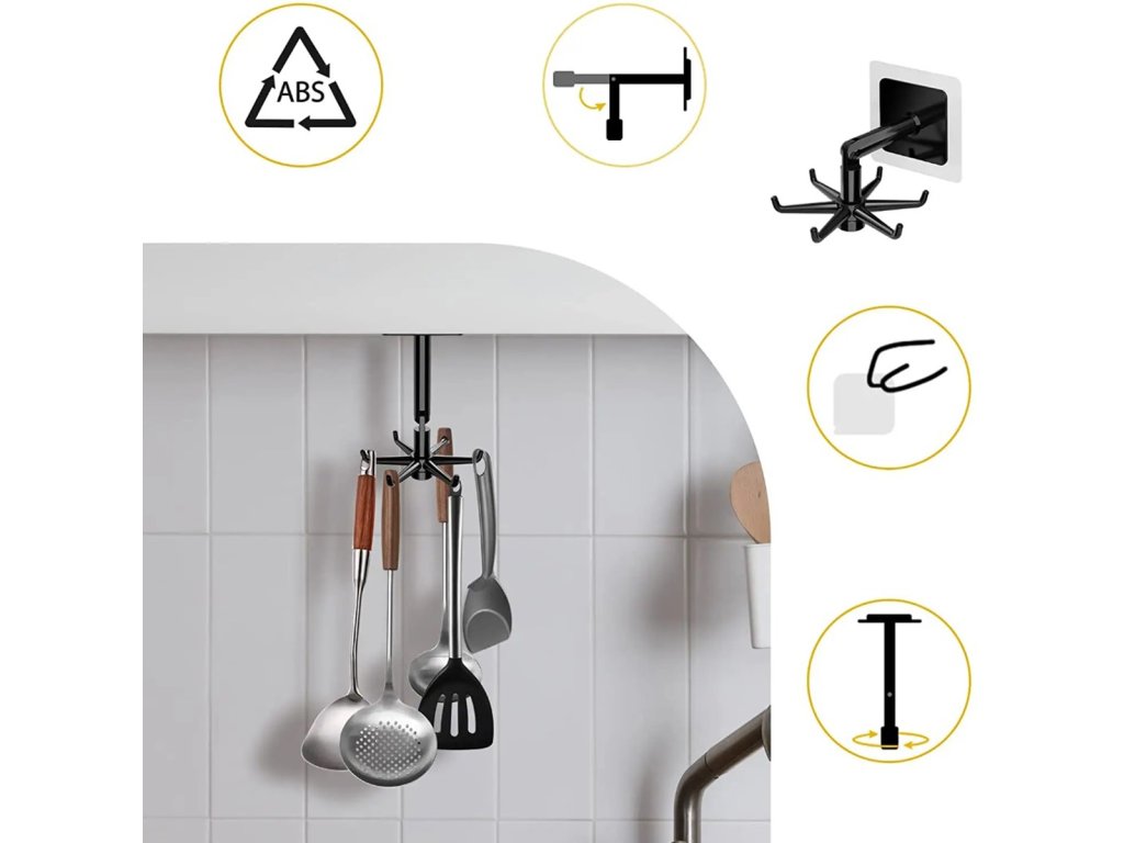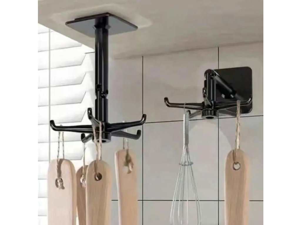 Samolepící kuchyňský věšák. Vybaveno až 6 háčky namontovanými na otočném přívěsku. Pohodlná, neinvazivní instalace pomocí pásky. Možnost sklopení ramene umožňuje instalaci věšáku jak svisle (pod skříňku), tak na stěnu.