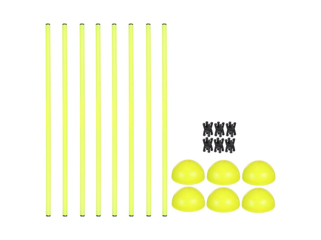 Sada agility překážek Kit Indoor 1.0 je skvělá pomůcka pro vaše tréninky v tělocvičně či hale. Agility překážky se hodí pro sportovce všech sportovních odvětví, kluby a školy. Díky překážkám si zlepšujete svou kondici, efektivně trénujete rychlost a koordinaci dolních i horních končetin. Výšku tyčí můžete upravovat dle libosti a nastavit tak obtížnost dráhy. Součástí sady je i praktická taška z polyesteru pro snadné přenášení a uskladnění mezi jednotlivými tréninky. Kopule lze naplnit pískem pro větší stabilitu. Parametry: - sada obsahuje: 9x tyč 100 cm; 6x základna; 6x spojka na tyče - materiál: PVC - hmotnost sady 3,6 kg - součástí praktická taškaDodatočné parametre