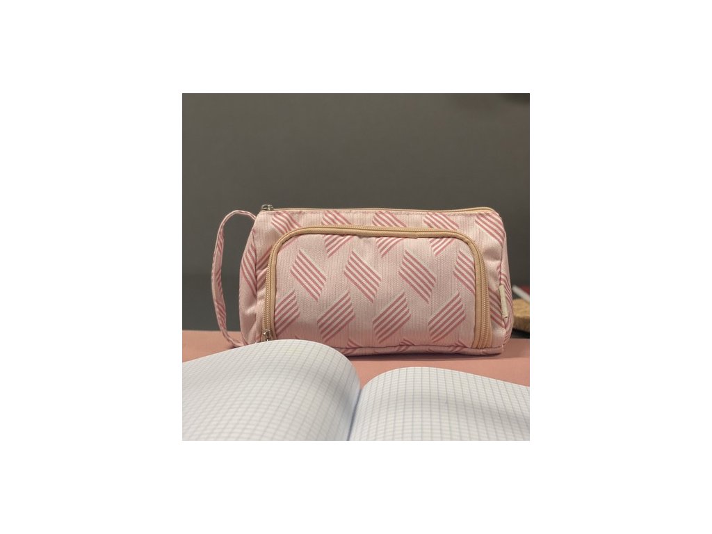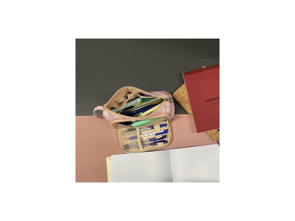 - PŘIHRÁDKA NA MATERIÁL - odděluje hlavní oddíl od přední výklopné chlopně a poskytuje další organizaci a ochranu předmětů. Otevřeno samostatně Přední klopa má samostatný zip , který umožňuje snadný přístup k obsahu, aniž byste museli otevírat hlavní prostor. Malá síťovaná kapsa umístěný na vnitřní straně chlopně, ideální pro uložení drobných předmětů, jako jsou mince, lepící papírky nebo klíče. Pět gumových rukojetí navržený pro držení per, tužek nebo fixů a poskytuje snadný přístup k nejčastěji používanému příslušenství.