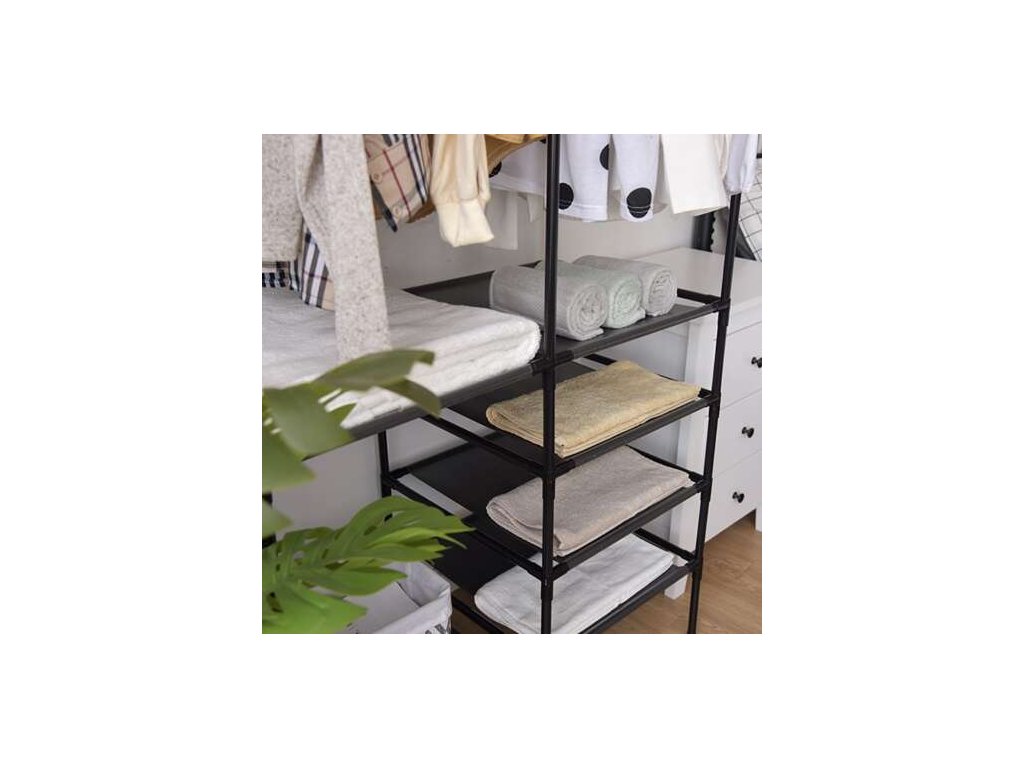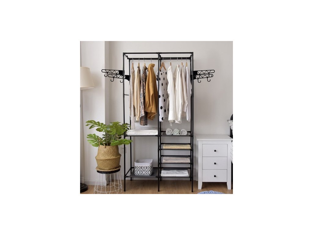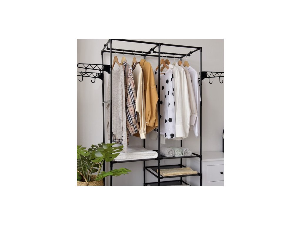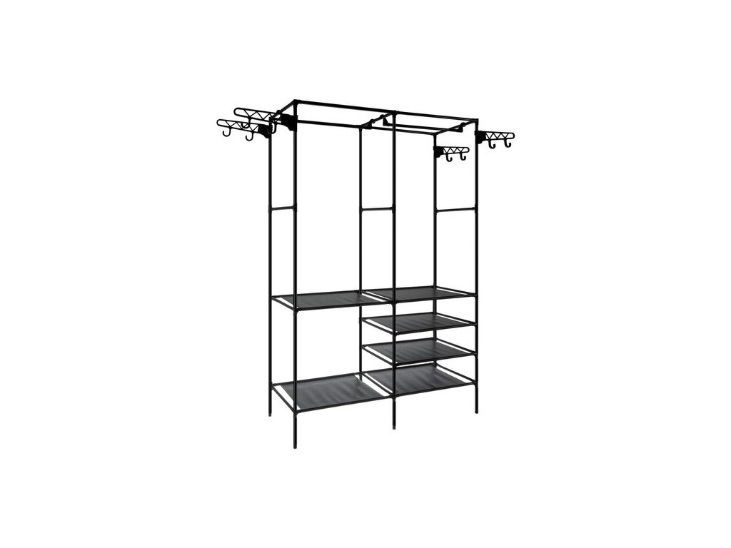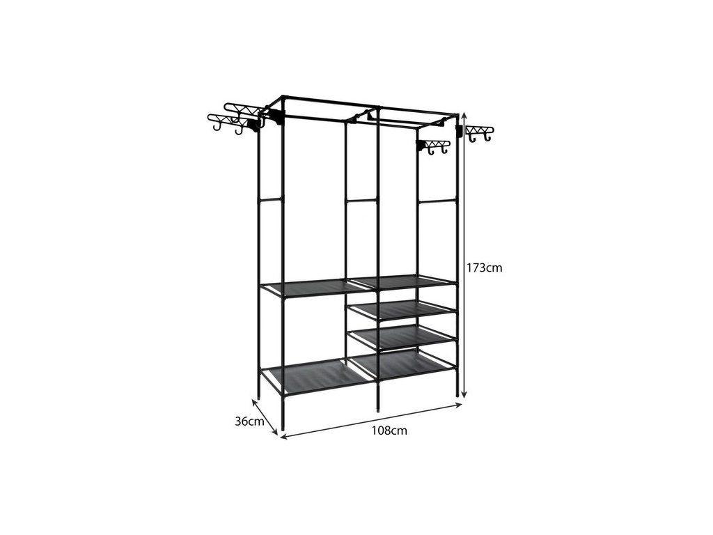 - SPECIFIKACE - Černá barva; materiál: plast + kov; počet polic: 6; počet závěsných tyčí: 2; počet bočních závěsů 8; rozměry: 173 x 36 x 108 cm; hmotnost: 4,5 kg; hmotnost balení: 4,9 kg.