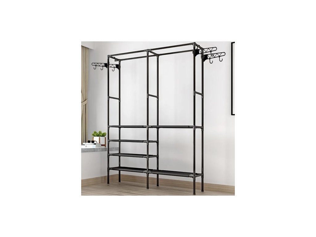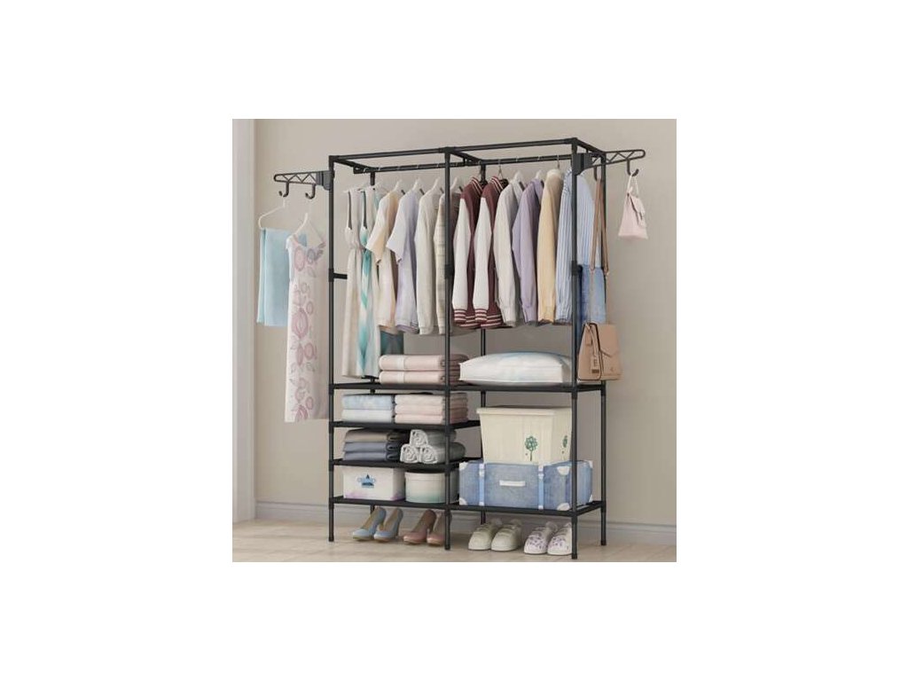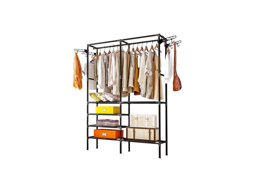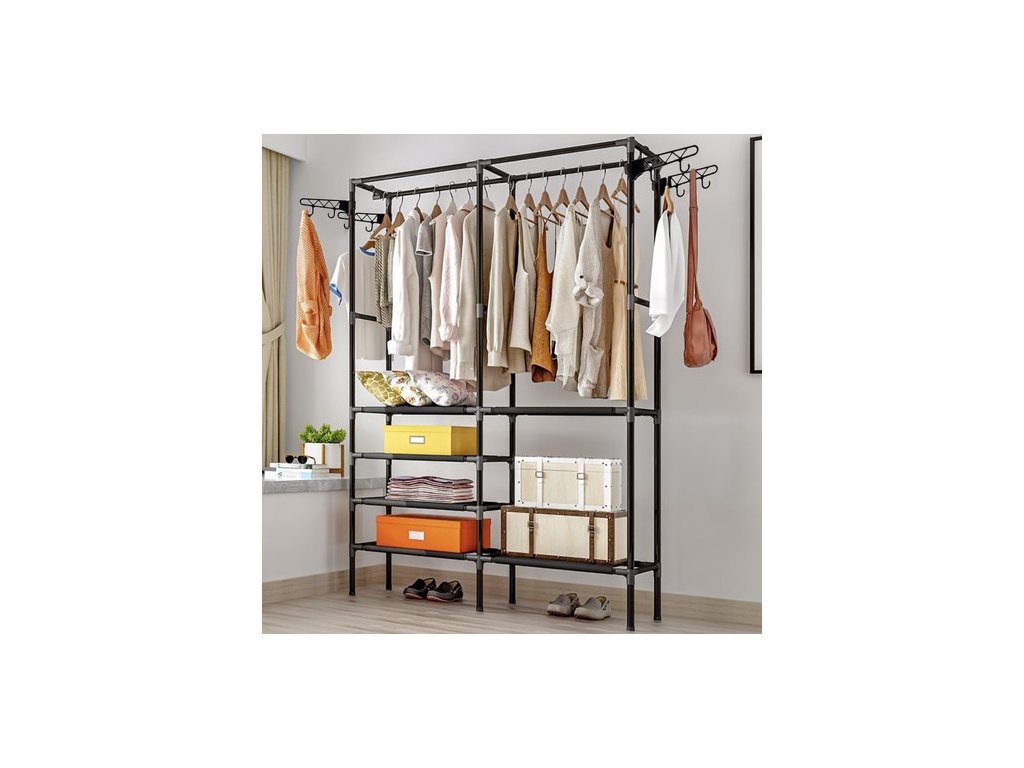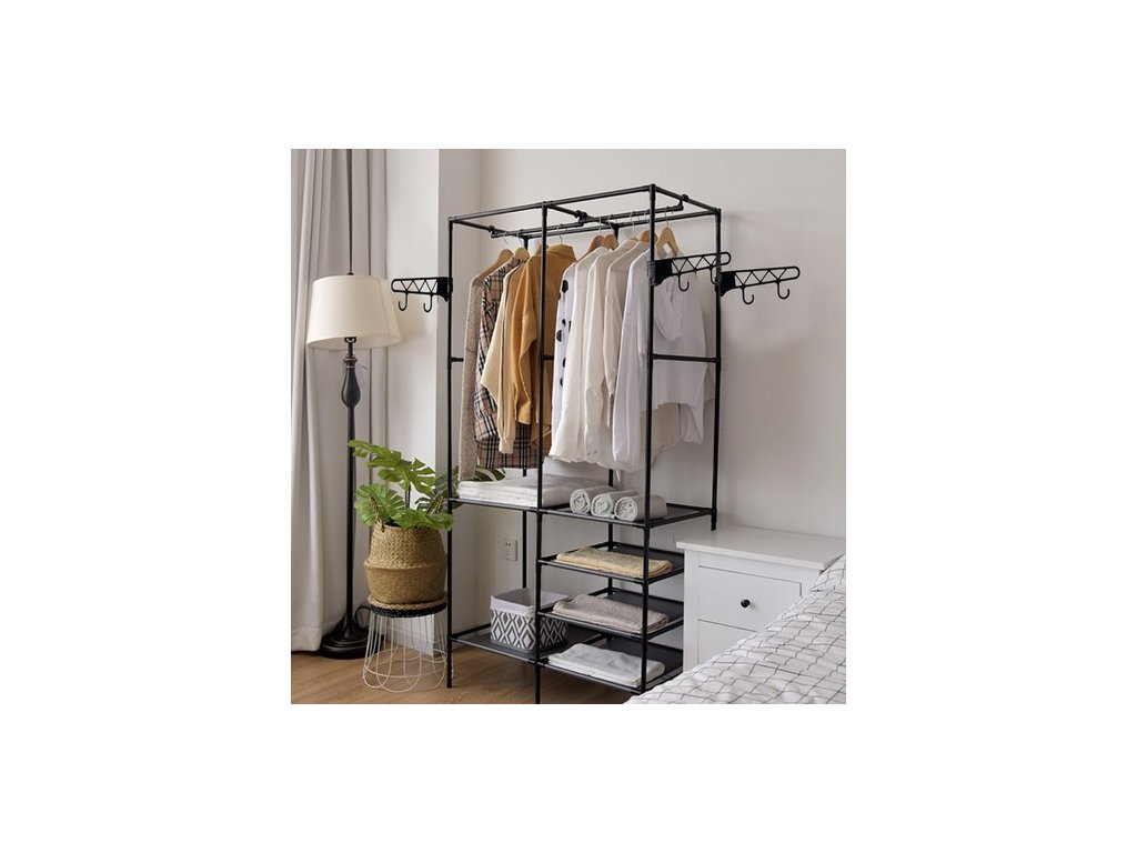 - SPECIFIKACE - Černá barva; materiál: plast + kov; počet polic: 6; počet závěsných tyčí: 2; počet bočních závěsů 8; rozměry: 173 x 36 x 108 cm; hmotnost: 4,5 kg; hmotnost balení: 4,9 kg.