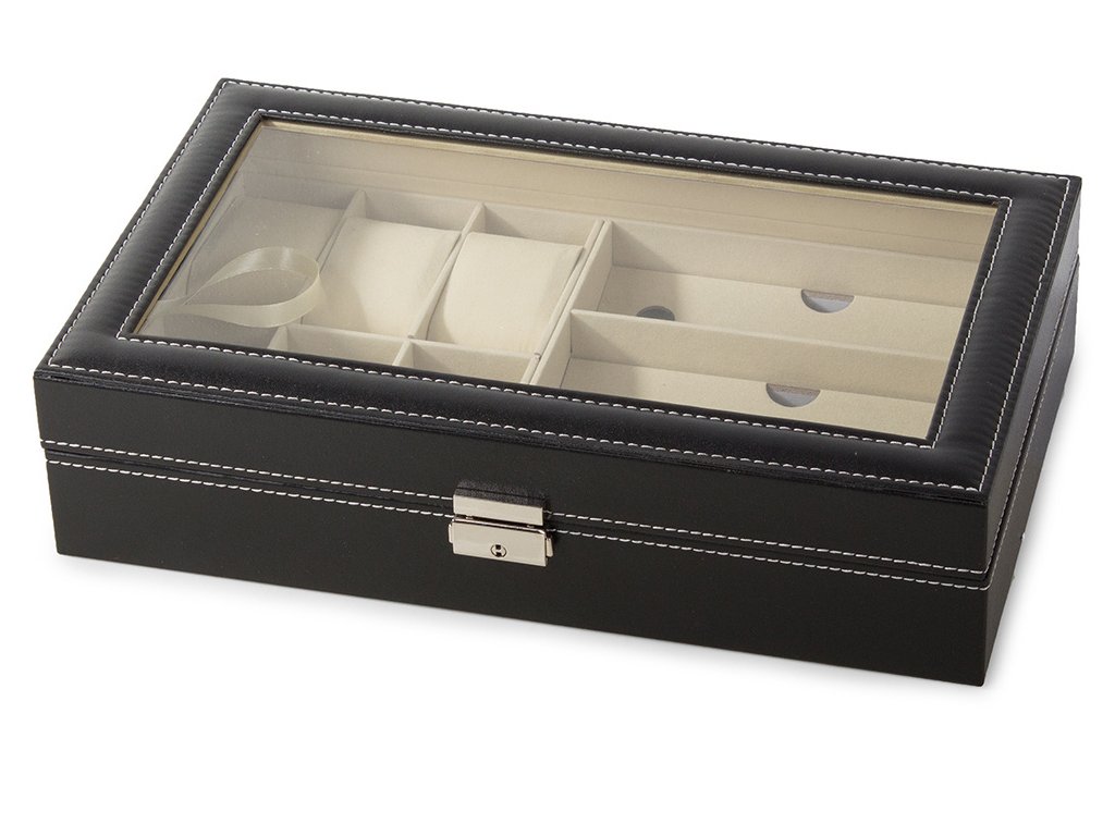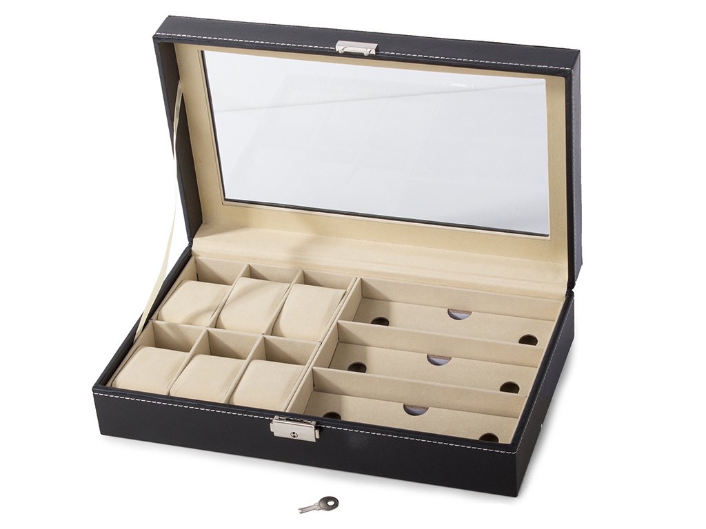 Prostorný organizér na hodinky a brýle. Pojme šest hodinek a tři páry brýlí. Vhodné také pro náramky a další šperky, stačí vyjmout vložky z jednotlivých přepážek. Pouzdro je vyrobeno z ekokůže, zatímco vnitřek je vyložen měkkým, jemným materiálem. Celek působí velmi elegantně zakončený bílým švem uprostřed. Ideální jako dárek pro muže i ženy.