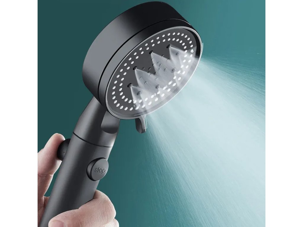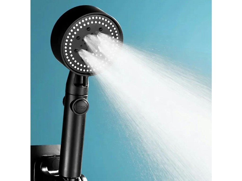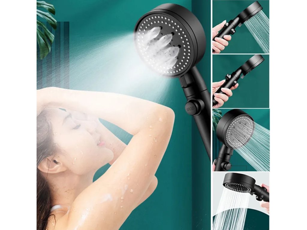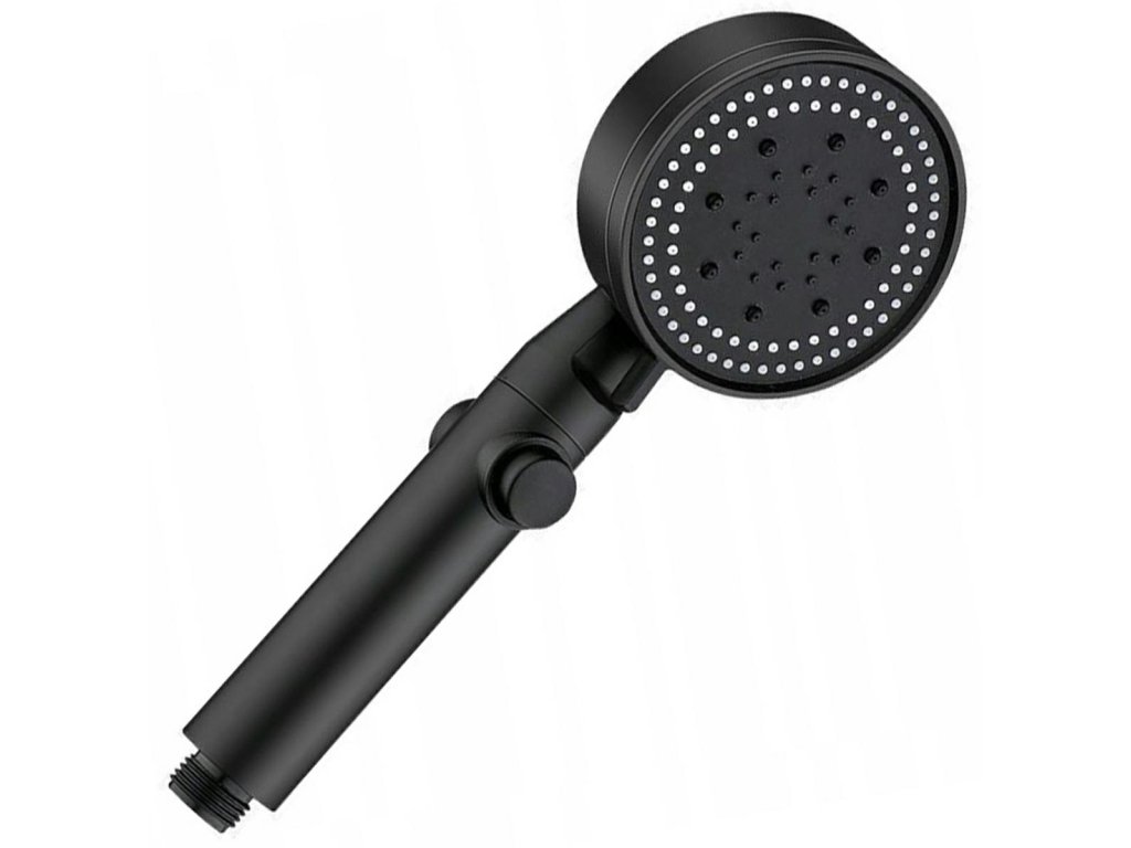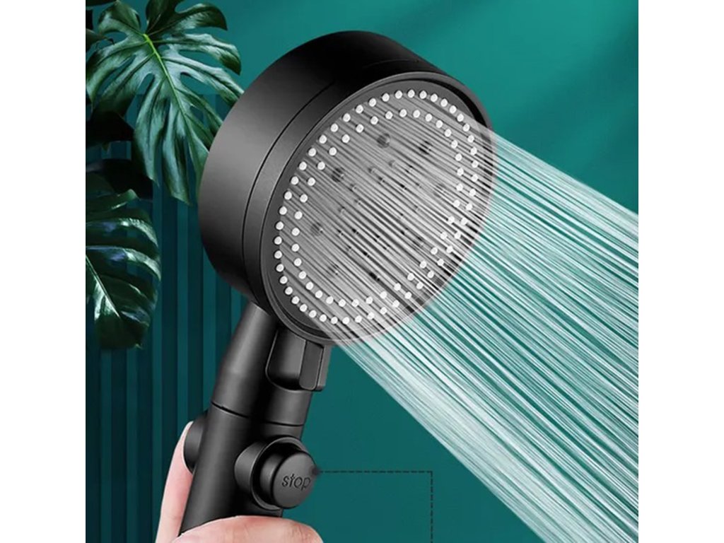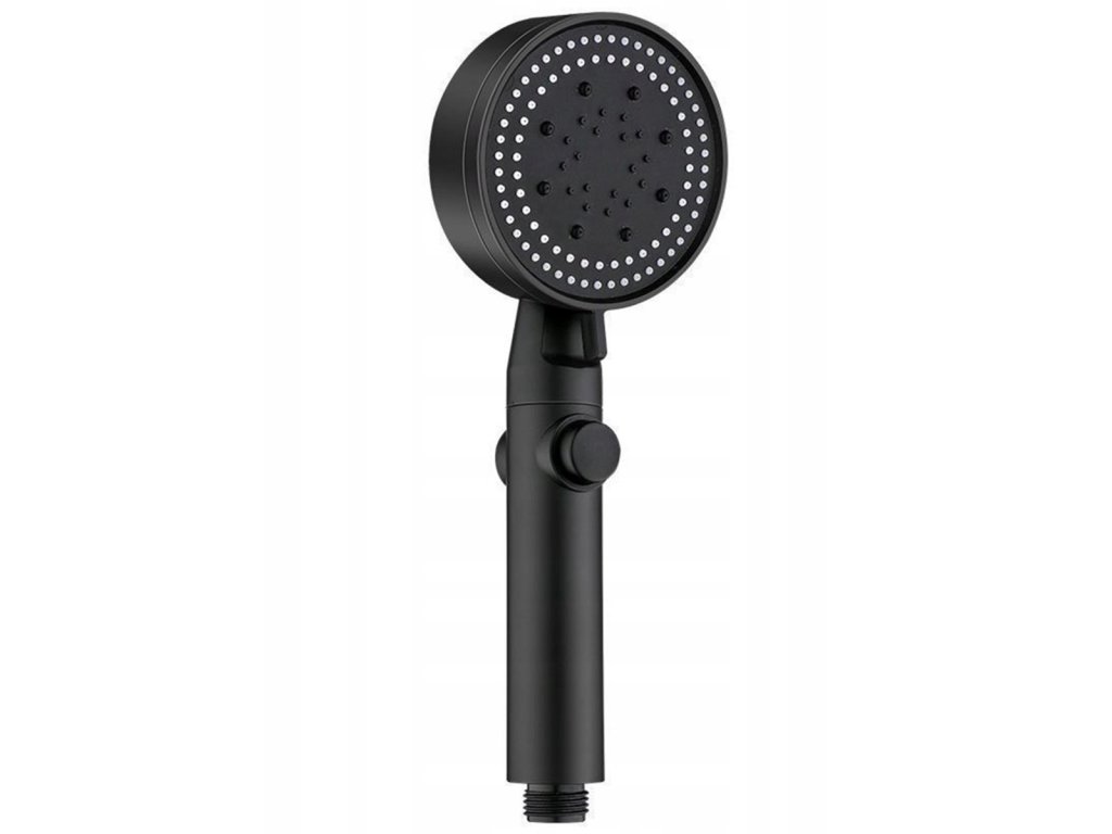 Černá sprchová hlavice. Určeno pro instalaci do standardní sprchové hadice. Hlavice má funkci volby režimu sprchování (5) a funkci STOP, která zastaví proud. Vestavěný ventilátor zvyšuje výkon sprchy bez zvýšení spotřeby vody.