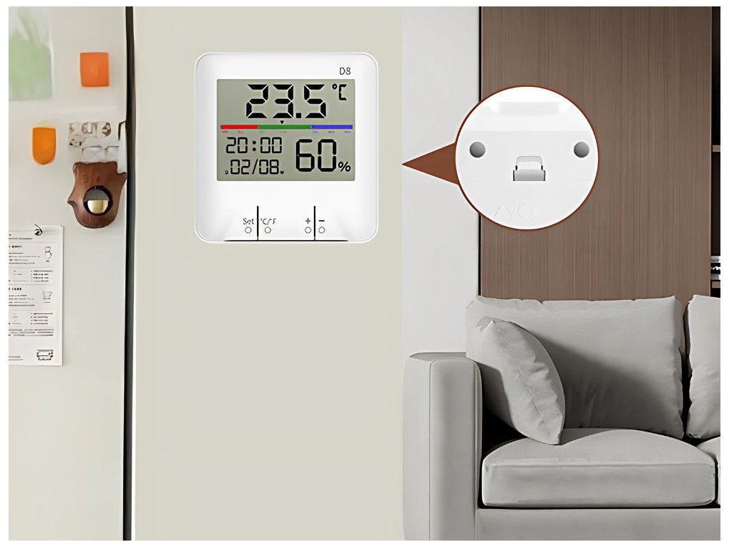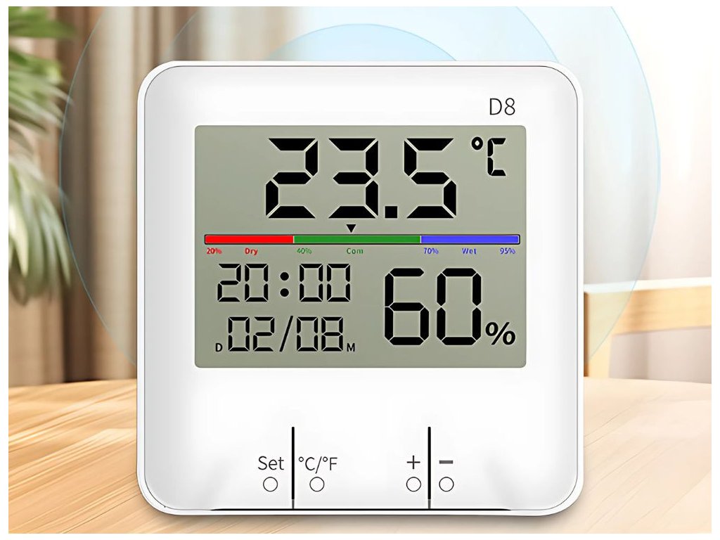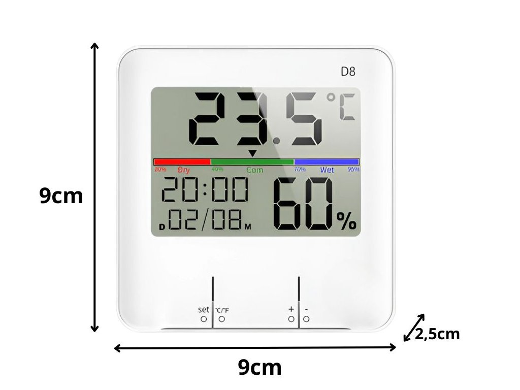 Na displeji se zobrazuje aktuální teplota (ve °C nebo °F ) a úroveň vlhkosti v místnosti. Barevný pruh ukazuje, zda je vzduch suchý, příjemný nebo příliš vlhký - ideální pomůcka pro zvlhčovače a topení.