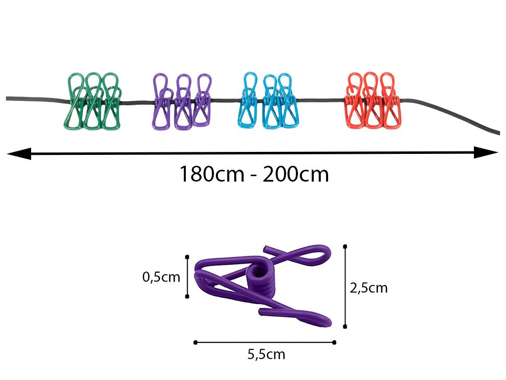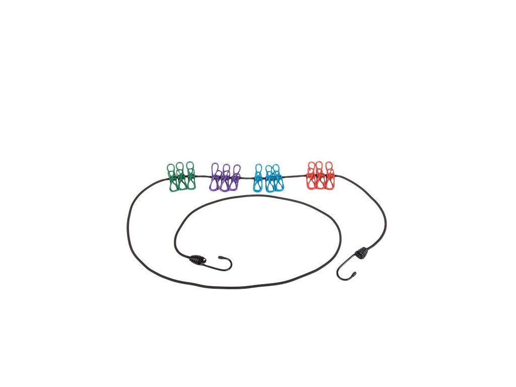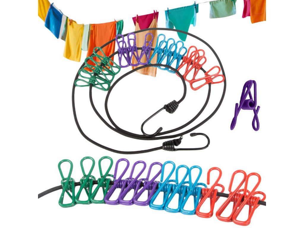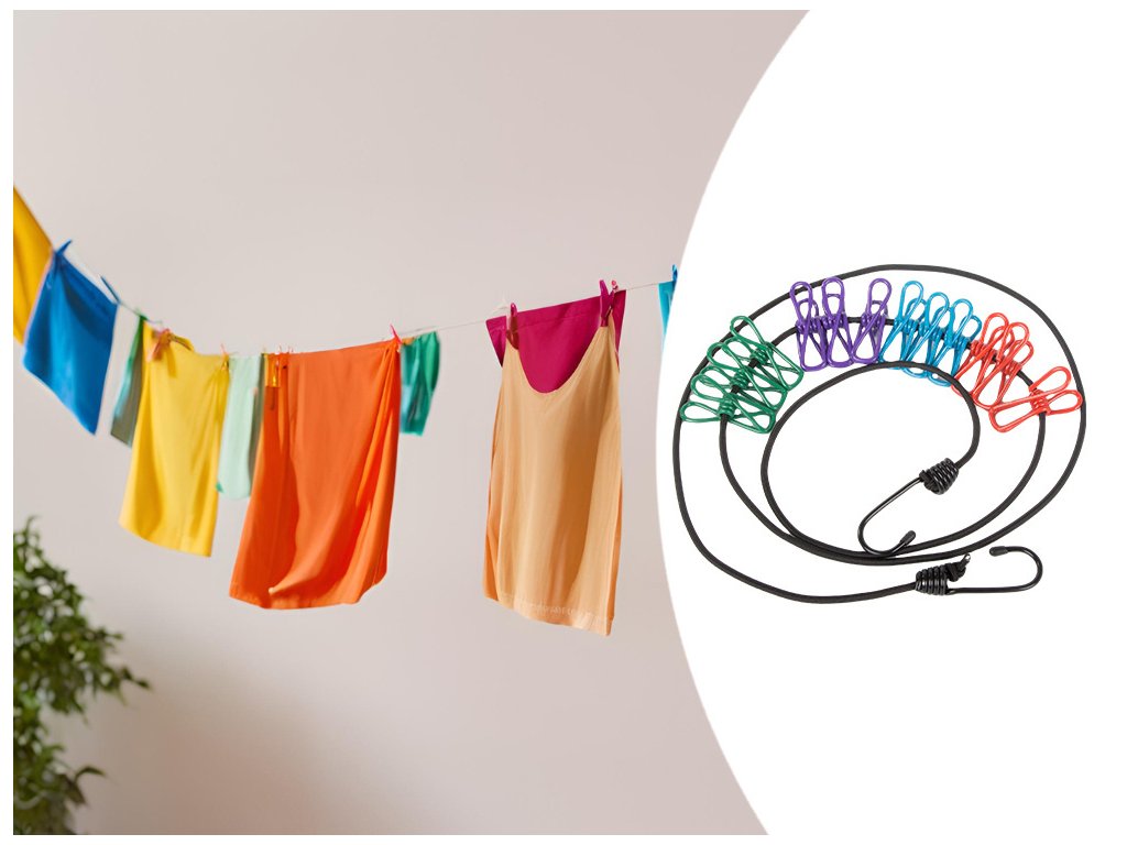 Elastické lano na praní s 12 kusy spon na prádlo je nepostradatelným doplňkem jak doma, tak při turistických výletech. Lano je vyrobeno z odolných a pružných materiálů a je ideální do různých povětrnostních podmínek. Možnostnastavení délky a roztažení umožňuje zavěsit ho kamkoli - ať už v kempu, na balkoně nebo v koupelně.