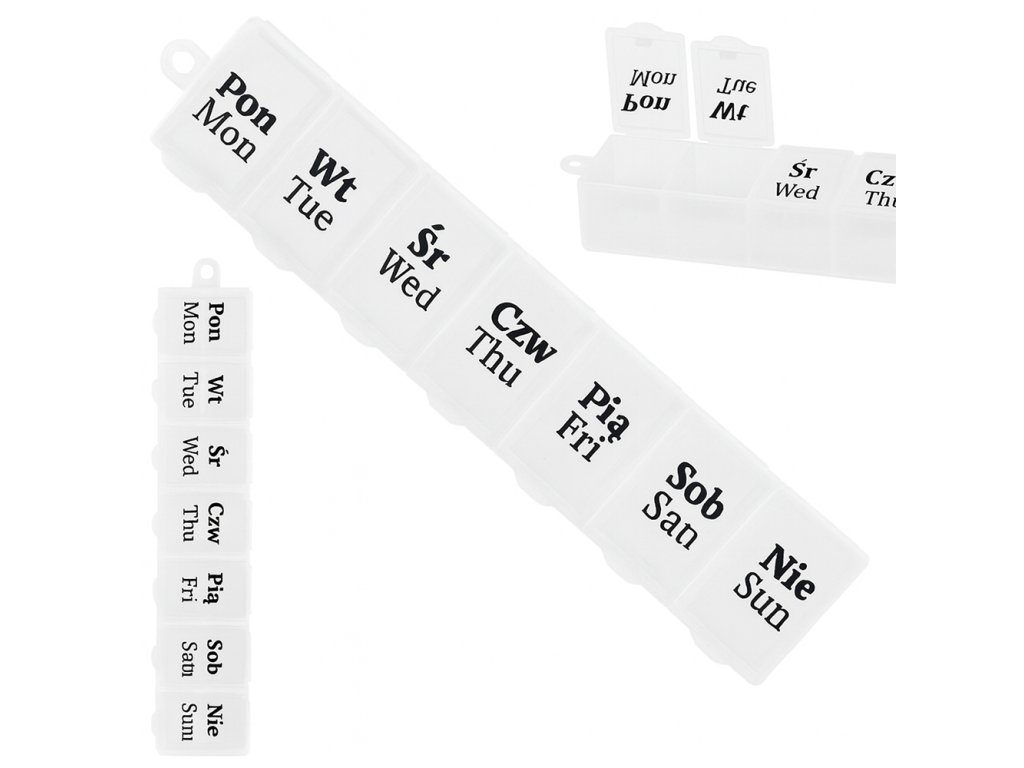 Týdenní zásobník na léky je sada sedmi plastových krabiček v jedné společné kazetě. Ideální řešení pro přípravu léků na celý týden, zejména pro chronicky nemocné osoby.