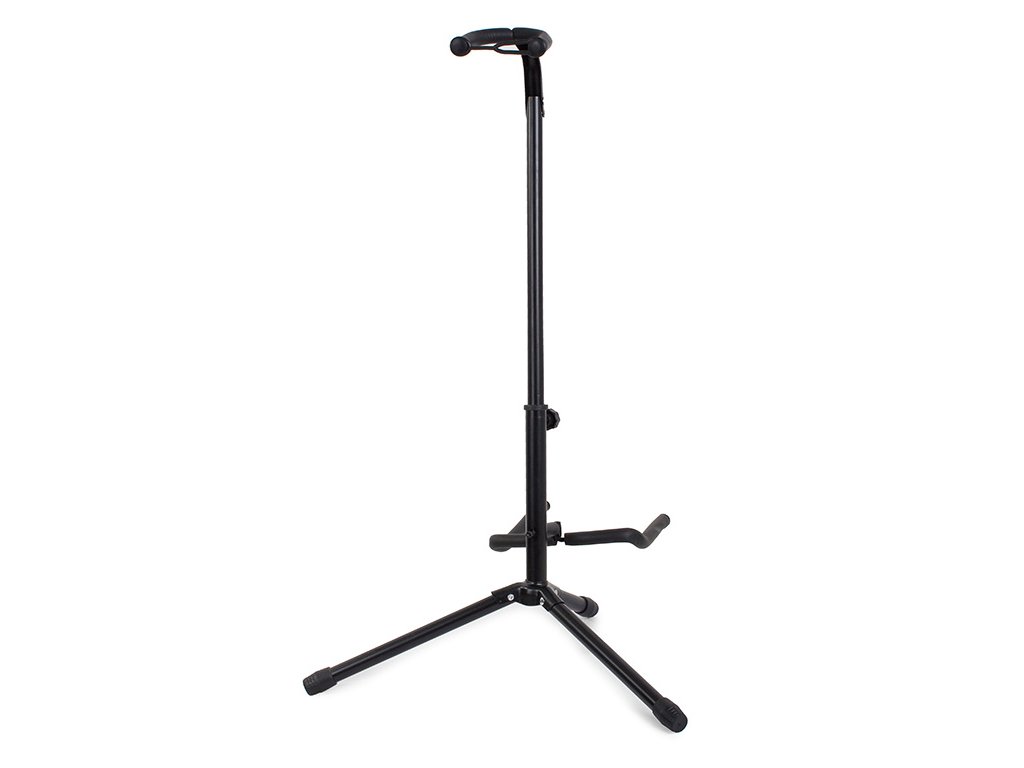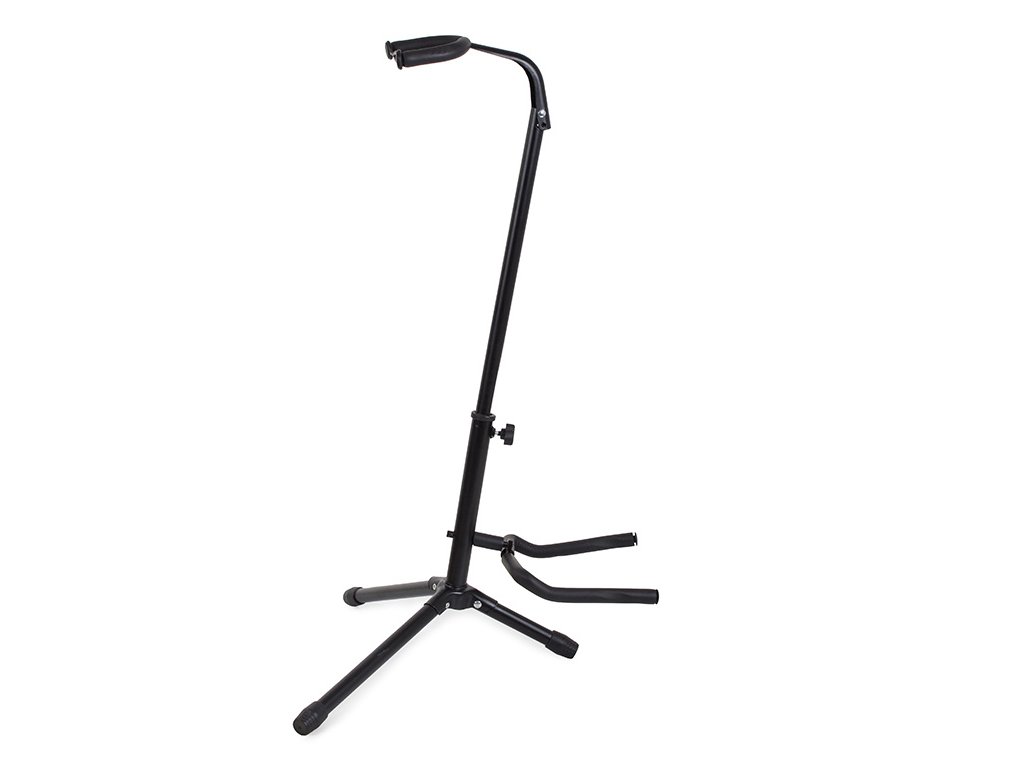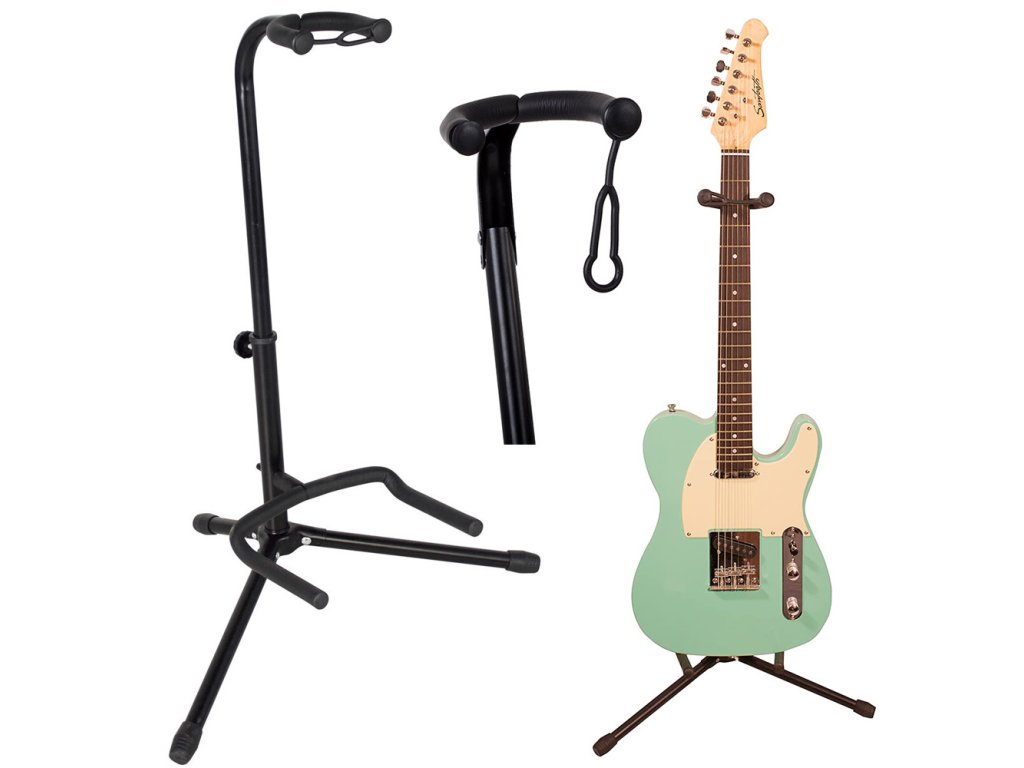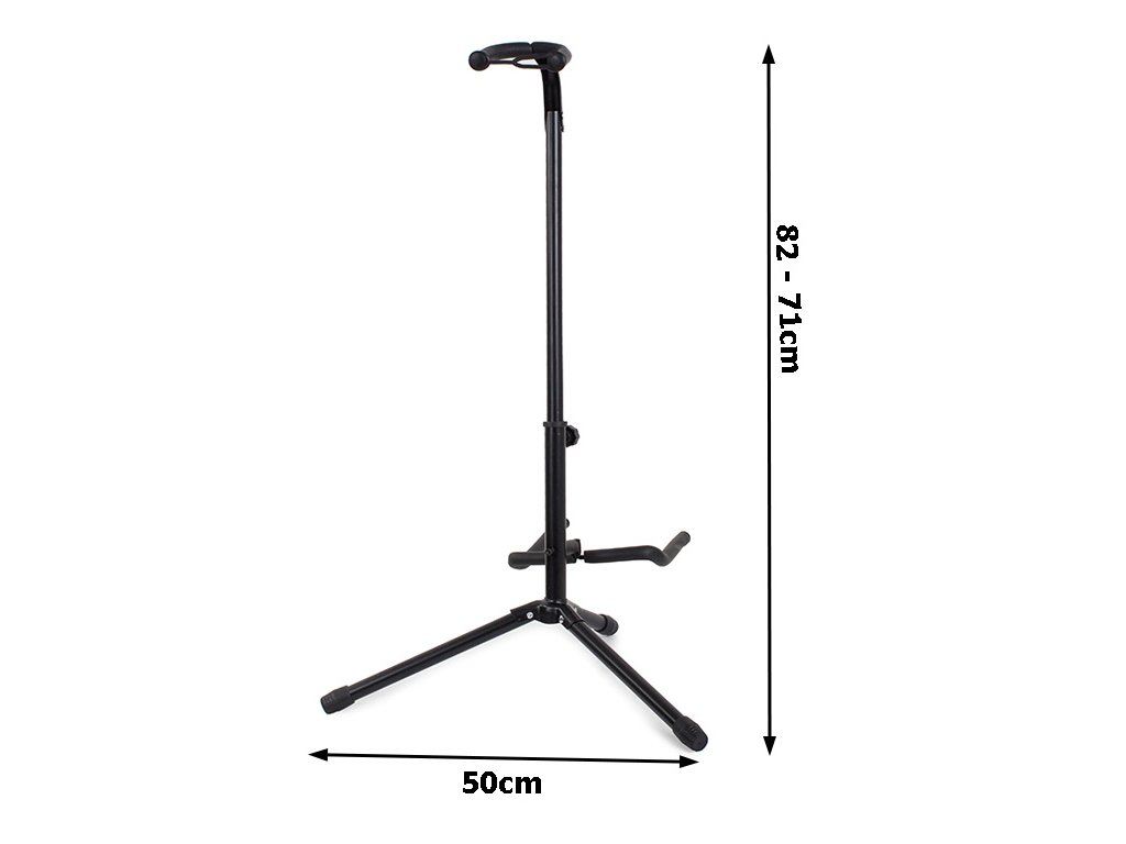 Stojan je vhodný pro klasickou, akustickou, elektrickou a basovou kytaru. Lehký a pohodlný s bezpečnostní pojistkou pro krk. Je výškově nastavitelný od 82 cm do 71 cm, aby vyhovoval různým výškám kytar.