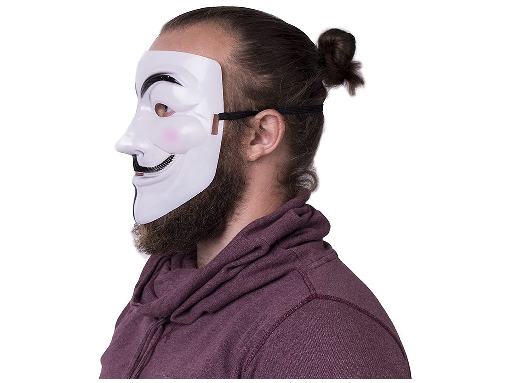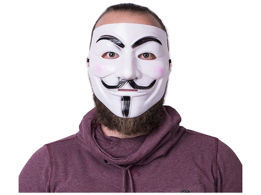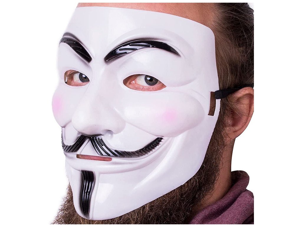 Maska, která je běžně spojována se skupinou Anonymous, byla atributem titulní postavy filmu "V jako Vendeta". Je to obraz Guye Fawkese - vůdce spiknutí v 17. století, jehož cílem byl atentát na krále Jakuba I. - a symbolizuje vzpouru.