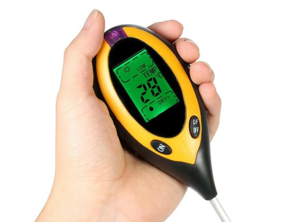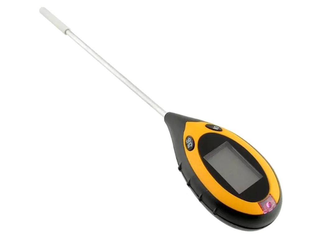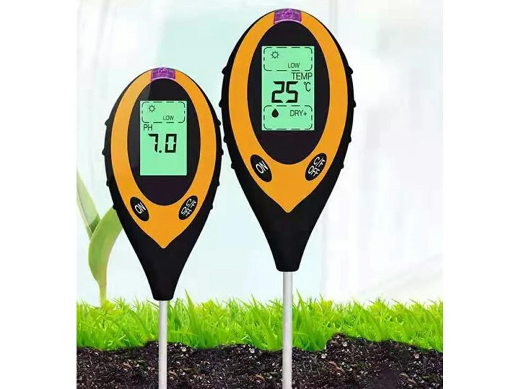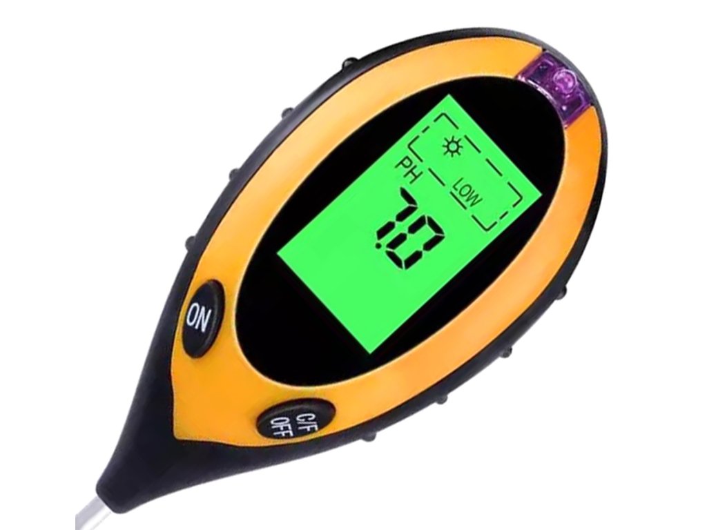 Elektronický měřič kyselosti půdy. Umožňuje určit potřebu vápnění a doporučené dávky vápníku pro regulaci pH půdy. Přístroj umožňuje provádět další měření, jako je vlhkost půdy, teplota a sluneční záření. Výsledky měření se zobrazují na přehledném LCD displeji s podsvícením. Dlouhá sonda umožňuje měření v hloubce až 20 cm. Zařízení je napájeno 9V baterií (nevyžaduje přístup k elektřině) a jeho kompaktní rozměry umožňují jeho přenášení kamkoli.