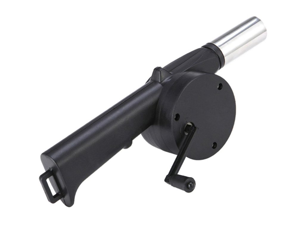 - Použití dmychadla je velmi jednoduché, stačí se přiblížit k ohni nebo uhlíkům a začít otáčet klikou – turbína umístěná uvnitř pouzdra vygeneruje příslušný proud vzduchu, který bude oheň šířit.