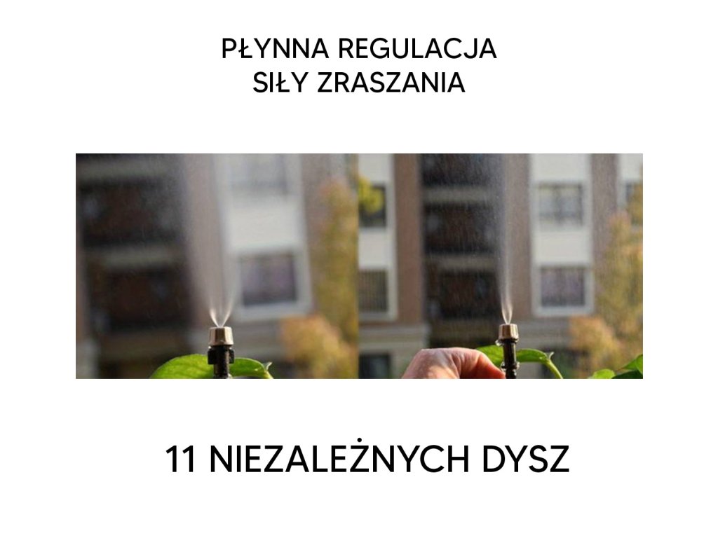 - Vybaven až 11 tryskami vytvářejícími vodní mlhu.