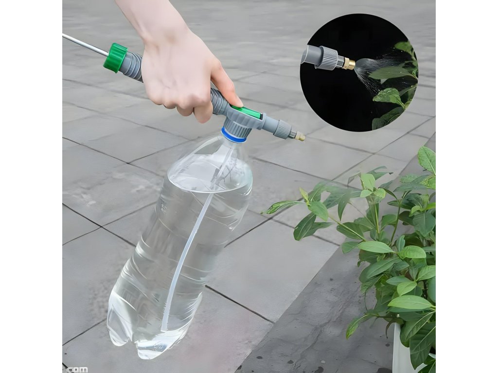 Všestranný ruční tlakový postřikovač s nastavitelnou tryskou. Určen pro montáž na PET lahev (standardní závit). Robustní mosazná tryska zajišťuje dlouhé a bezproblémové používání. Tento postřikovač je ideální pro letní a jarní úklid zahrady.
