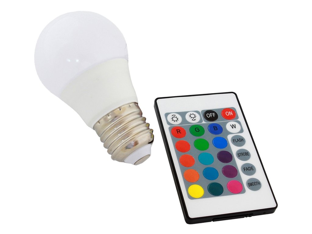 Barevná RGB LED žárovka ovládaná infračerveným (IR) dálkovým ovladačem. Vybaveno standardním, velkým závitem E27, což rozhodně usnadňuje použití v tradičních nástěnných lampách! Žárovka svítí až 16 barvami, které lze volně otáčet pomocí přiloženého dálkového ovladače! Navíc je možné nastavit intenzitu světla a režim svícení! Díky použití LED technologie je toto řešení mnohem energeticky úspornější než standardní žárovky! Přístroj je bezpečný, nenamáhá oči a nezahřívá se!